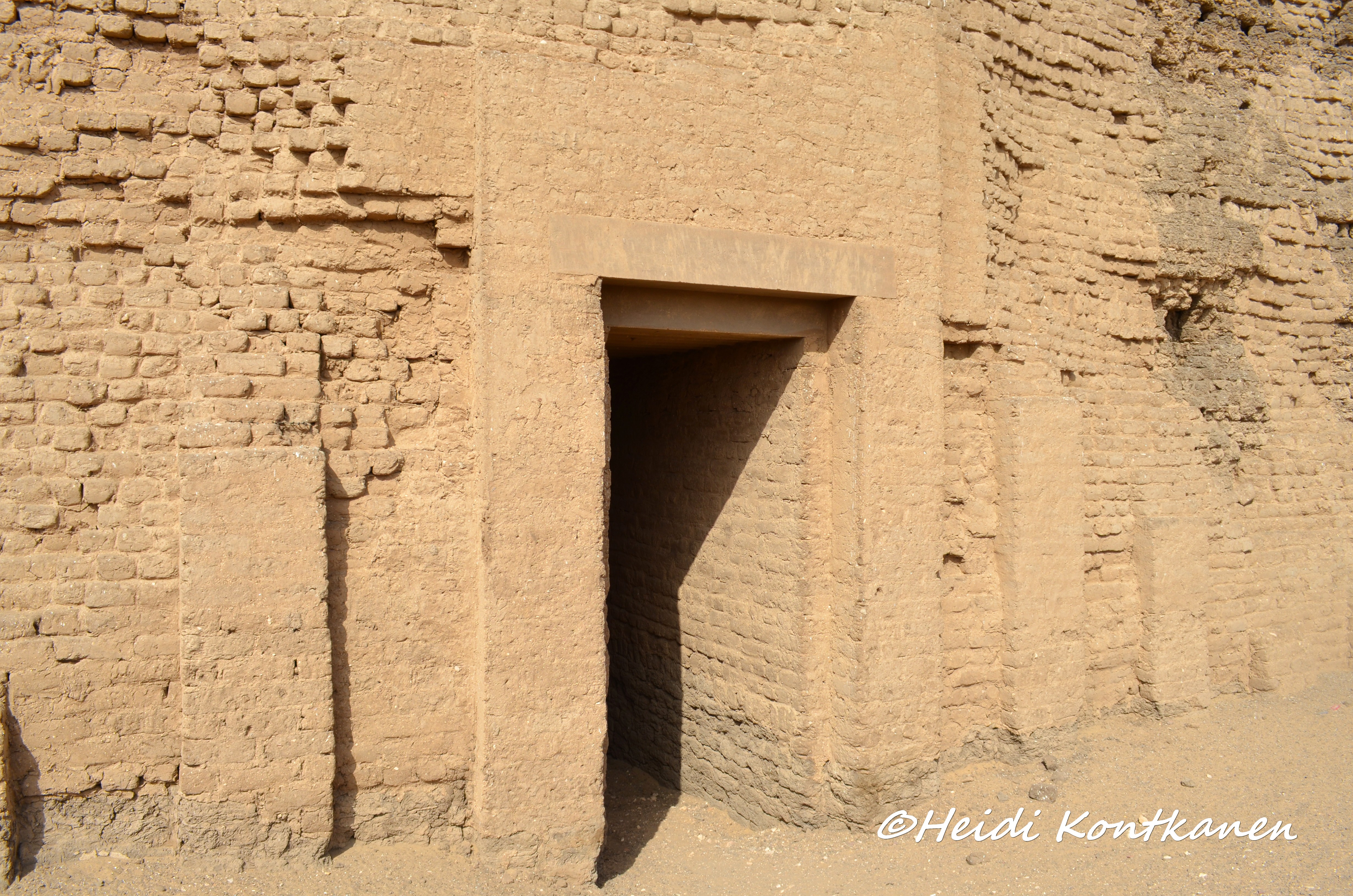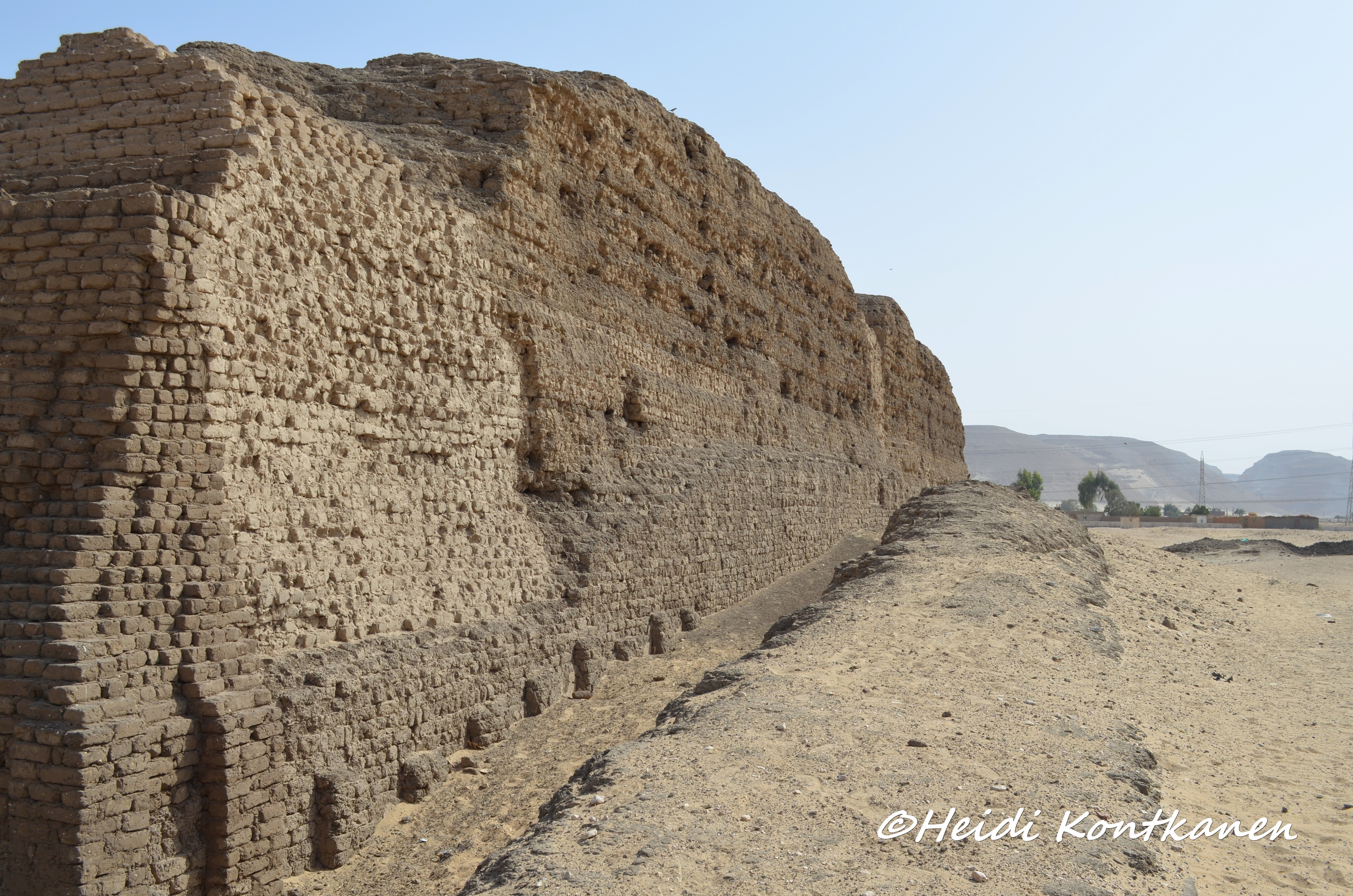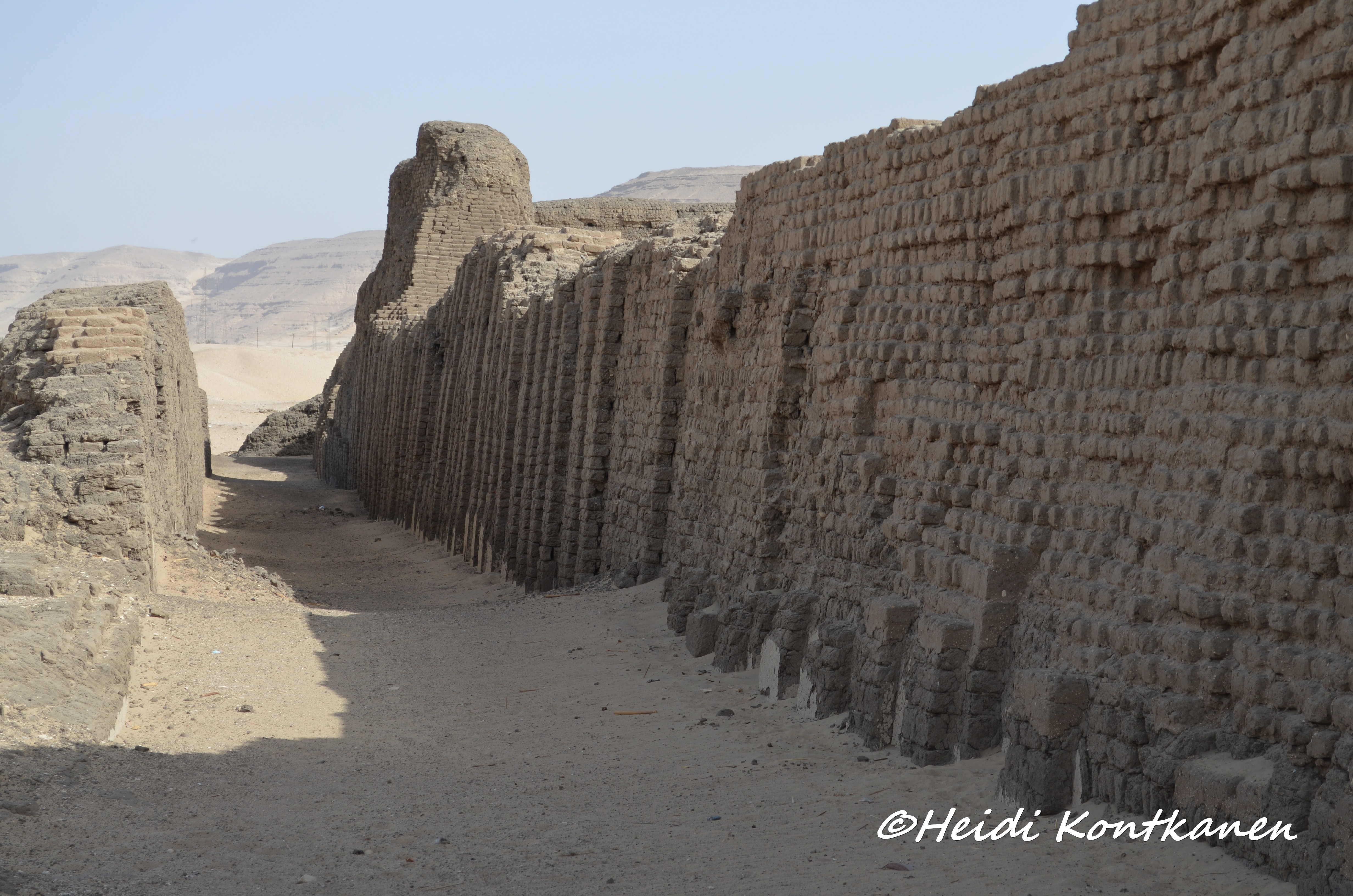 The facade of the inner wall was niched, imitating a royal palace facade. This and the enclosure wall around the pyramid complex of Djoser in Saqqara (3rd dynasty)