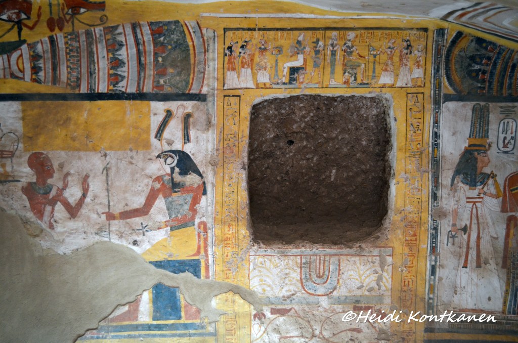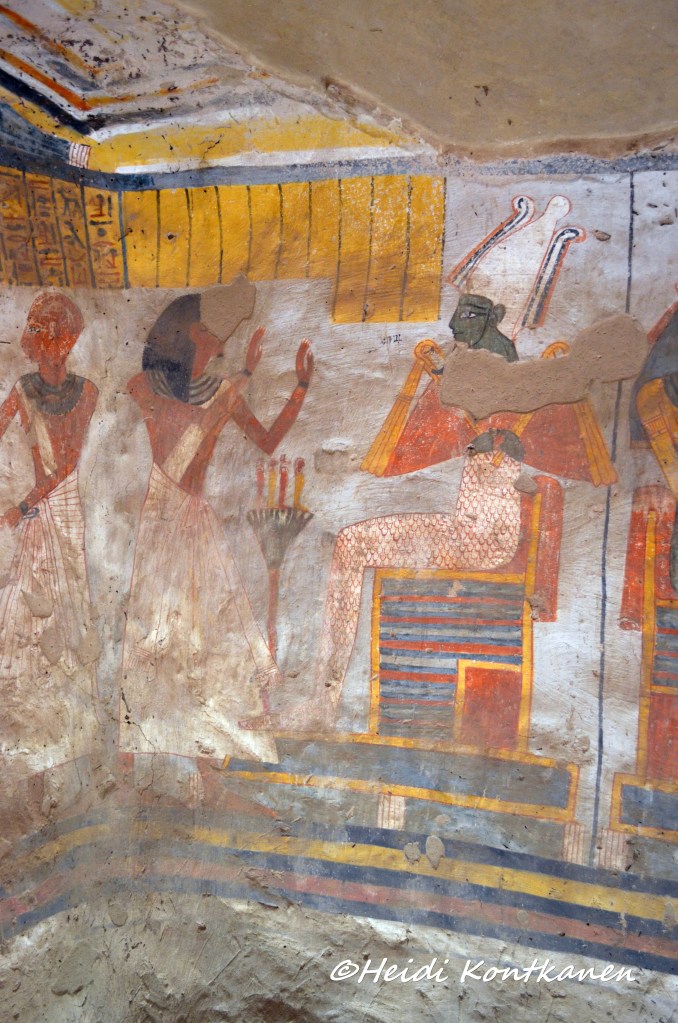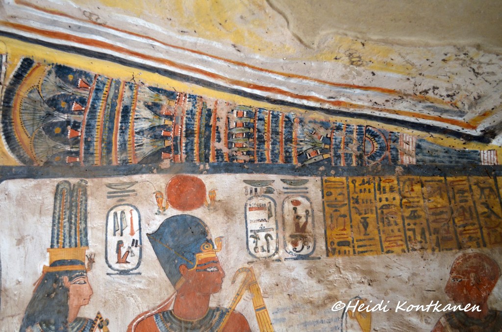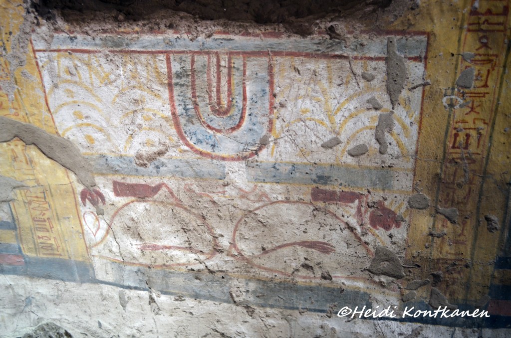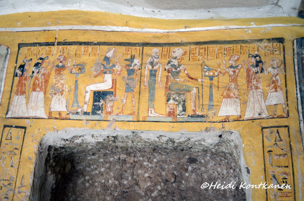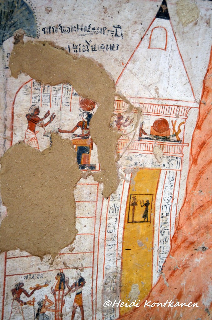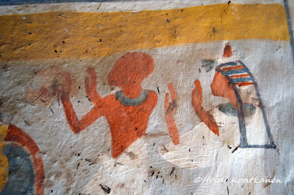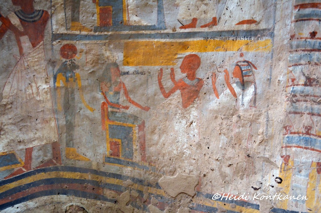 after the decorated entrance doorway, there is a small room with bright paintings, in which the illustrations seem to spring out from a bluish-white background. The texts are written in colourful hieroglyphs on a yellow background.