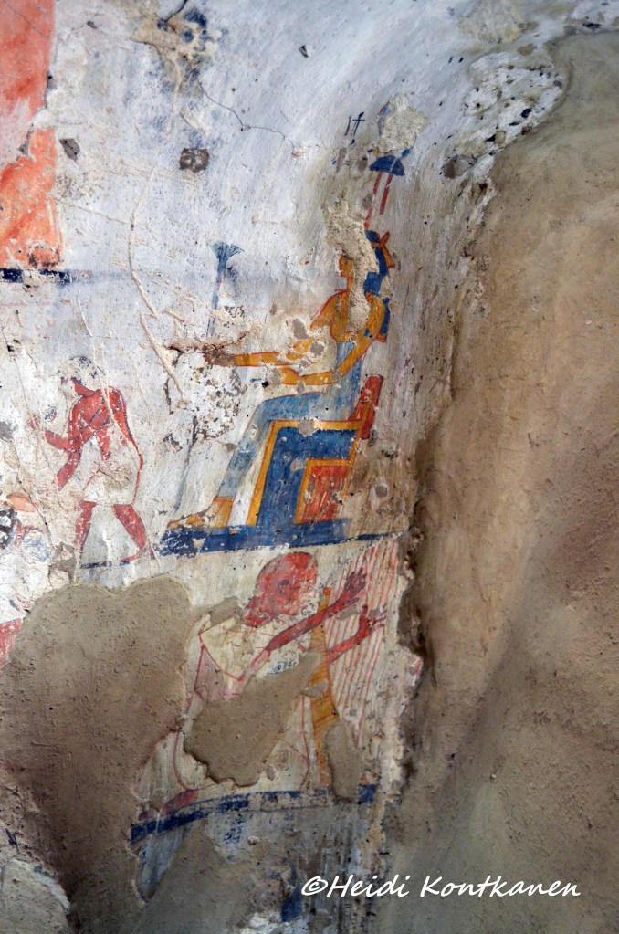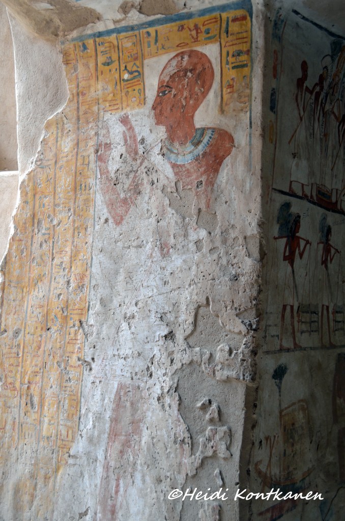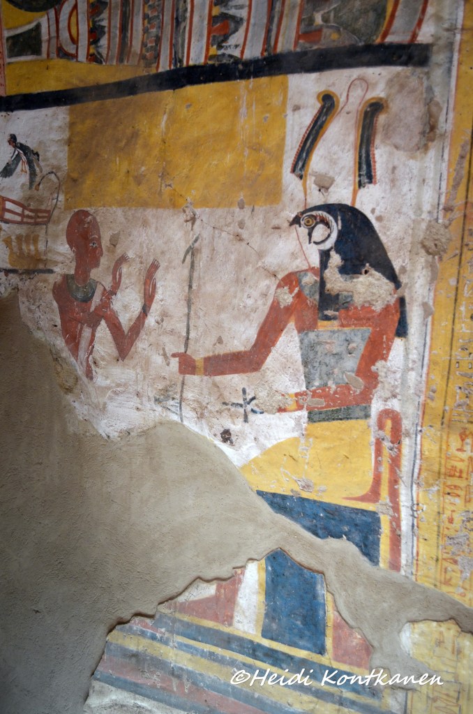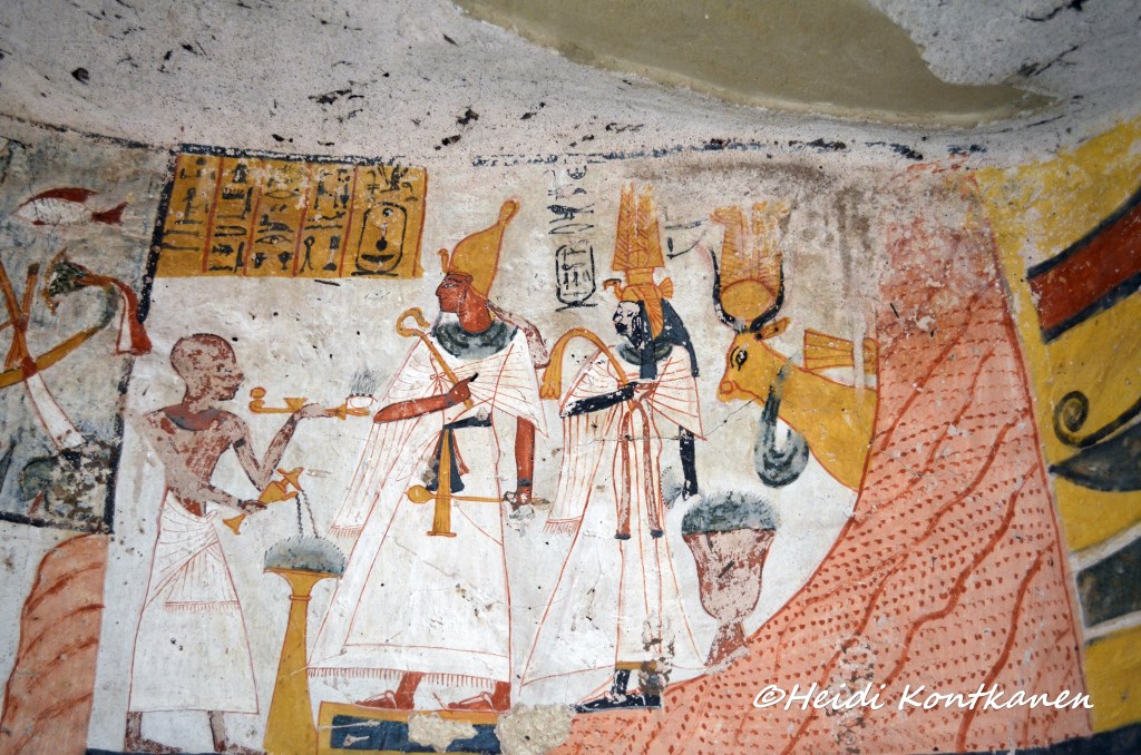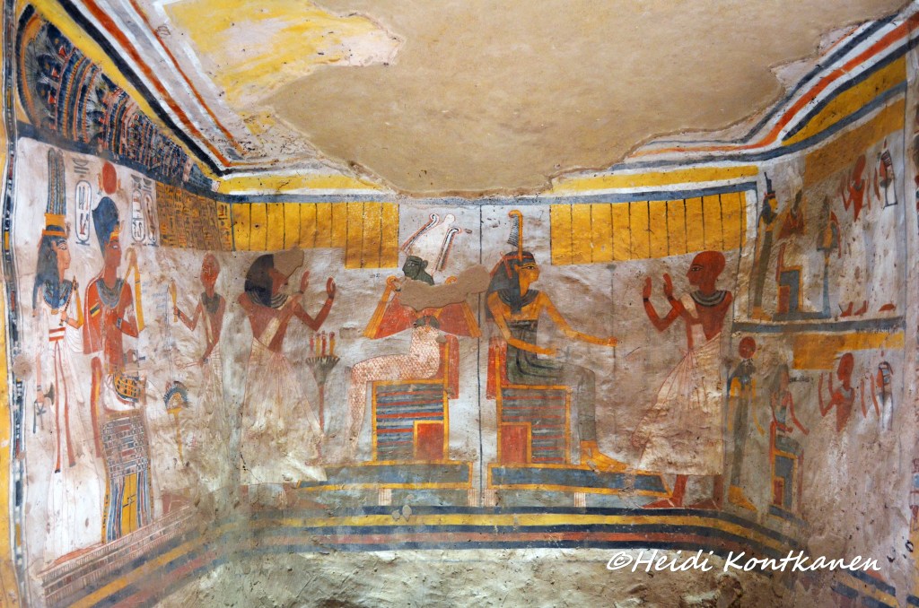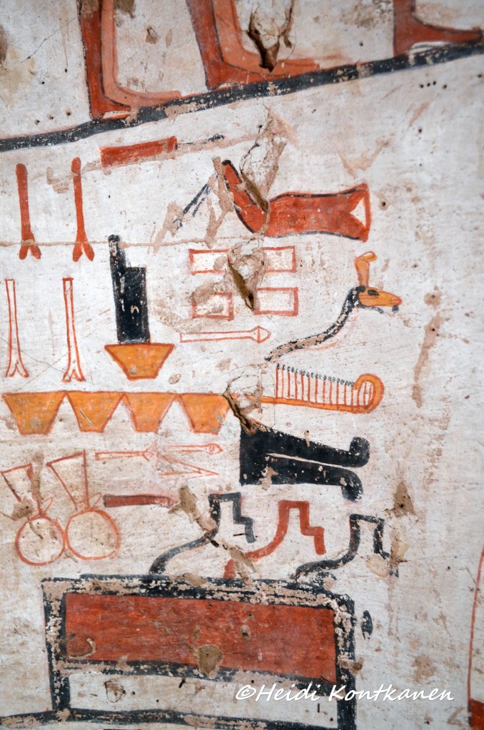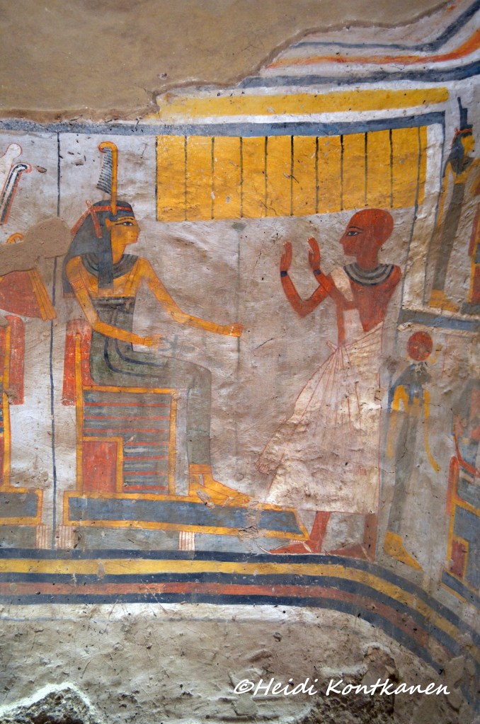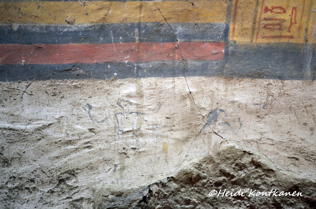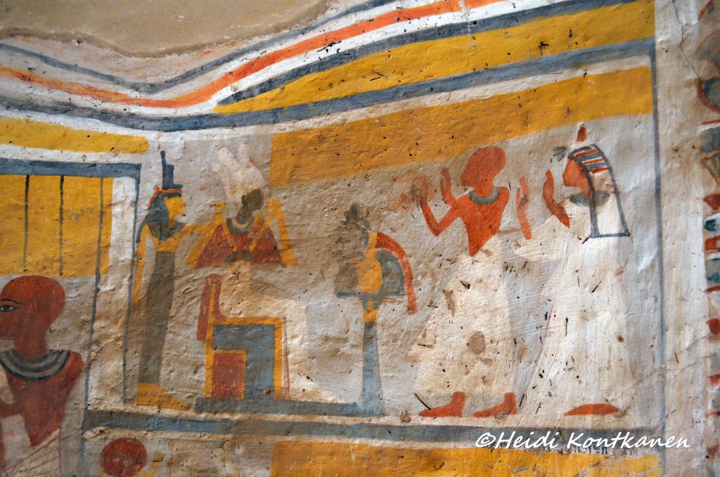 after the decorated entrance doorway, there is a small room with bright paintings, in which the illustrations seem to spring out from a bluish-white background. The texts are written in colourful hieroglyphs on a yellow background.