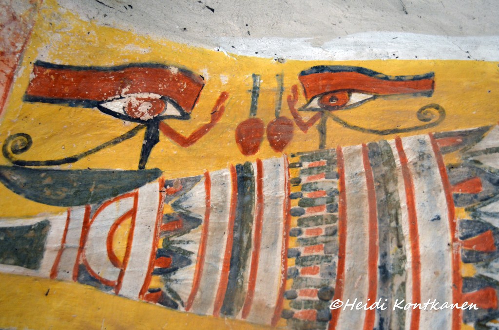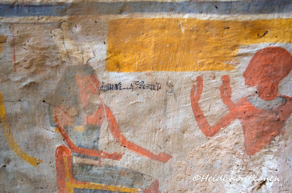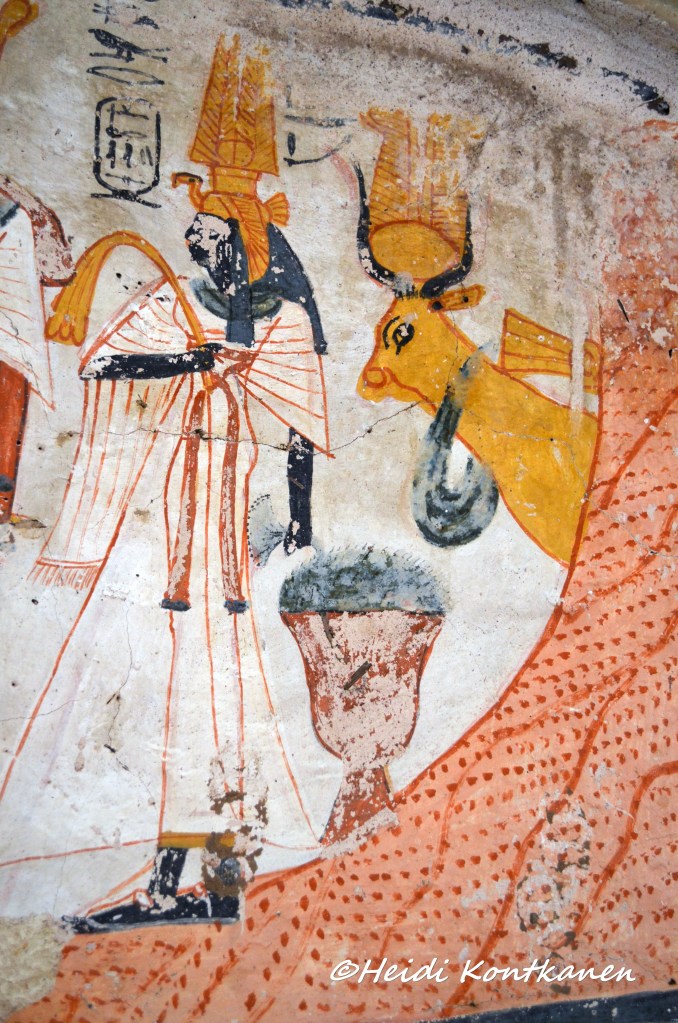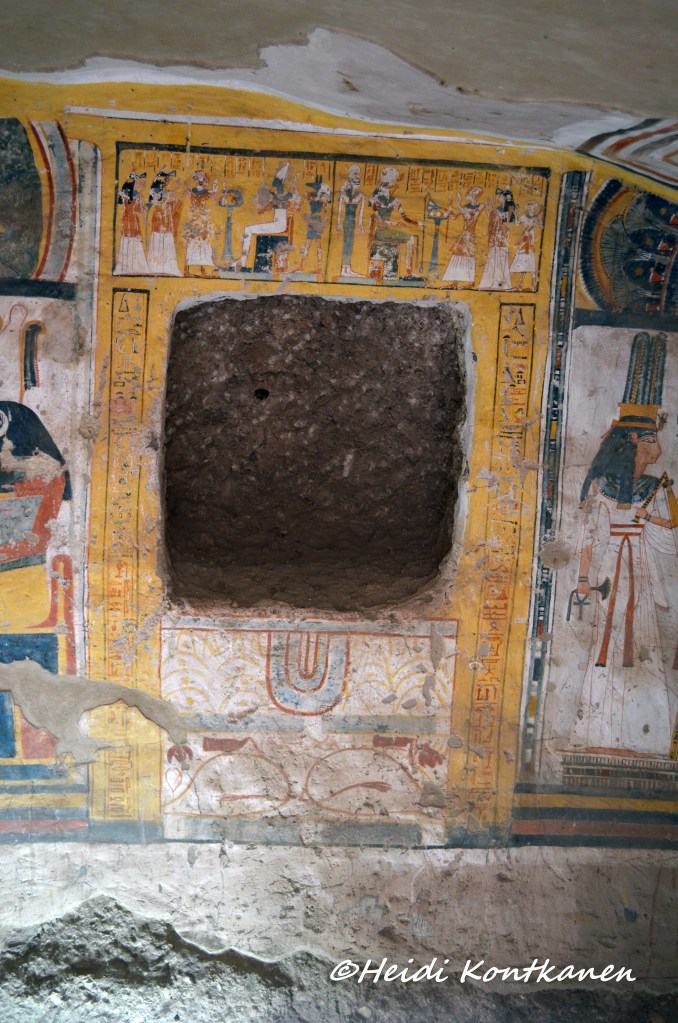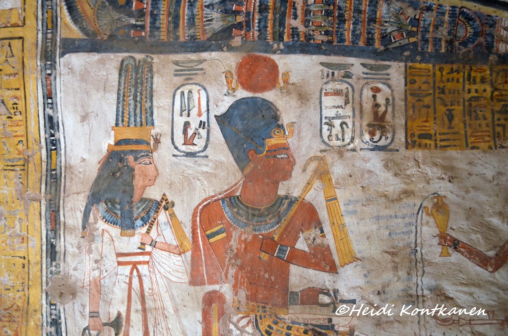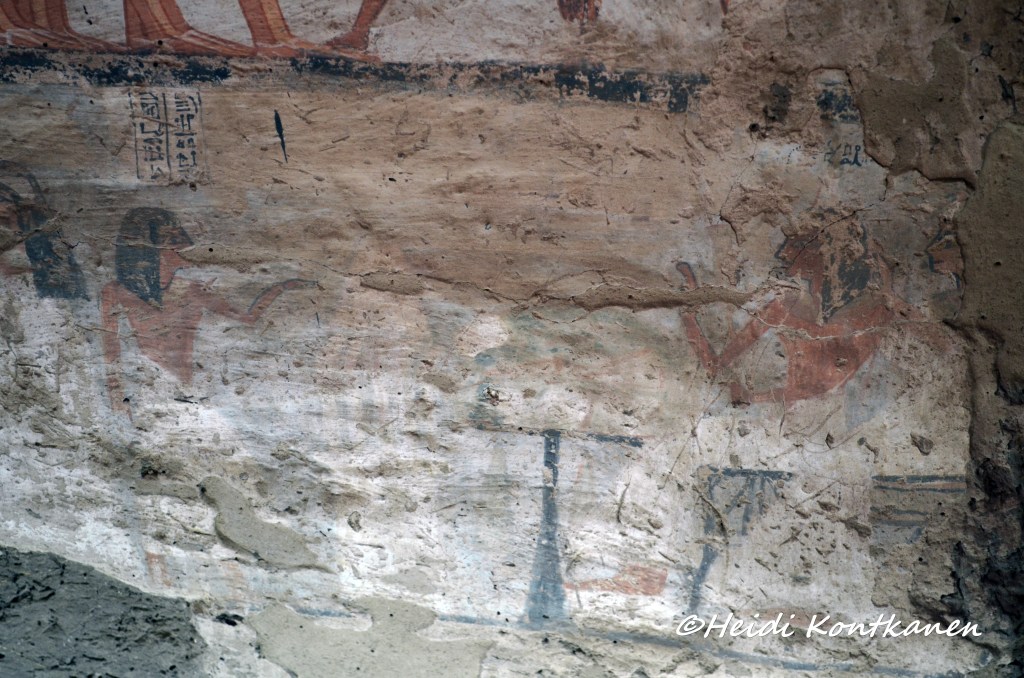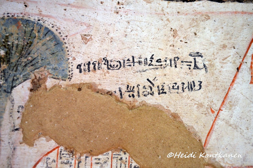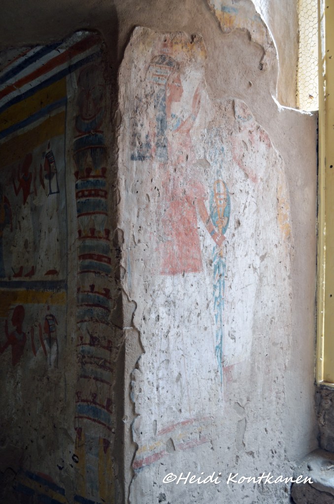 after the decorated entrance doorway, there is a small room with bright paintings, in which the illustrations seem to spring out from a bluish-white background. The texts are written in colourful hieroglyphs on a yellow background.