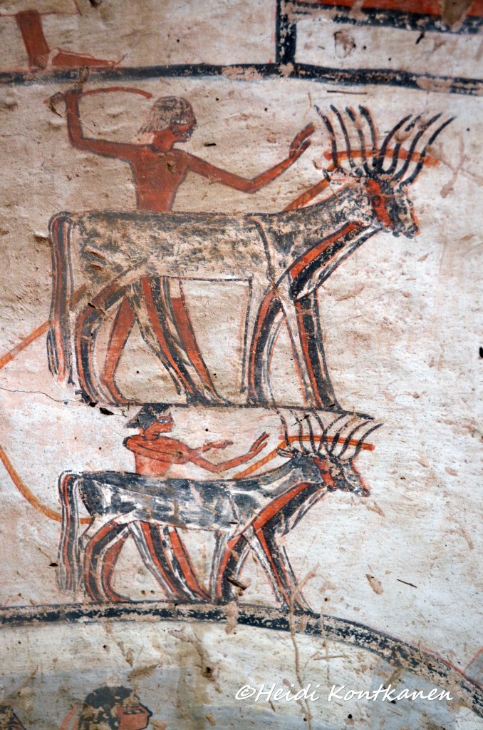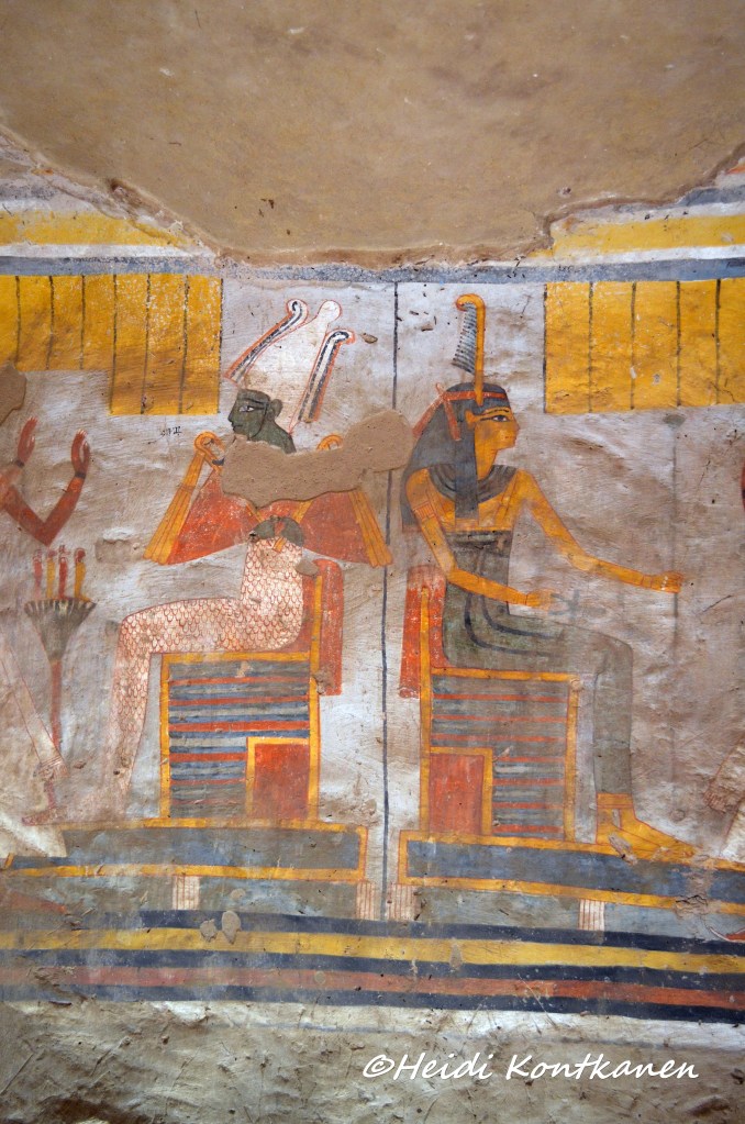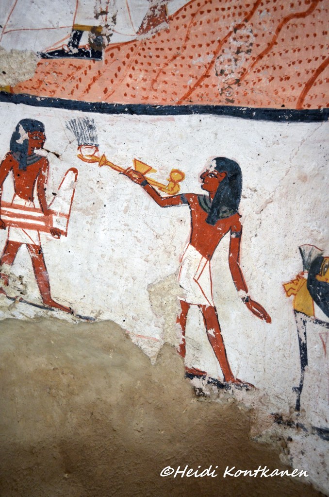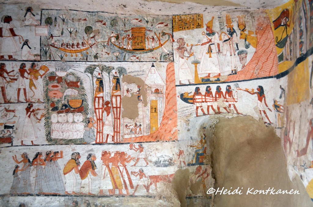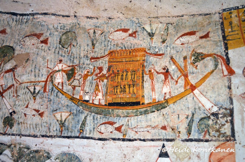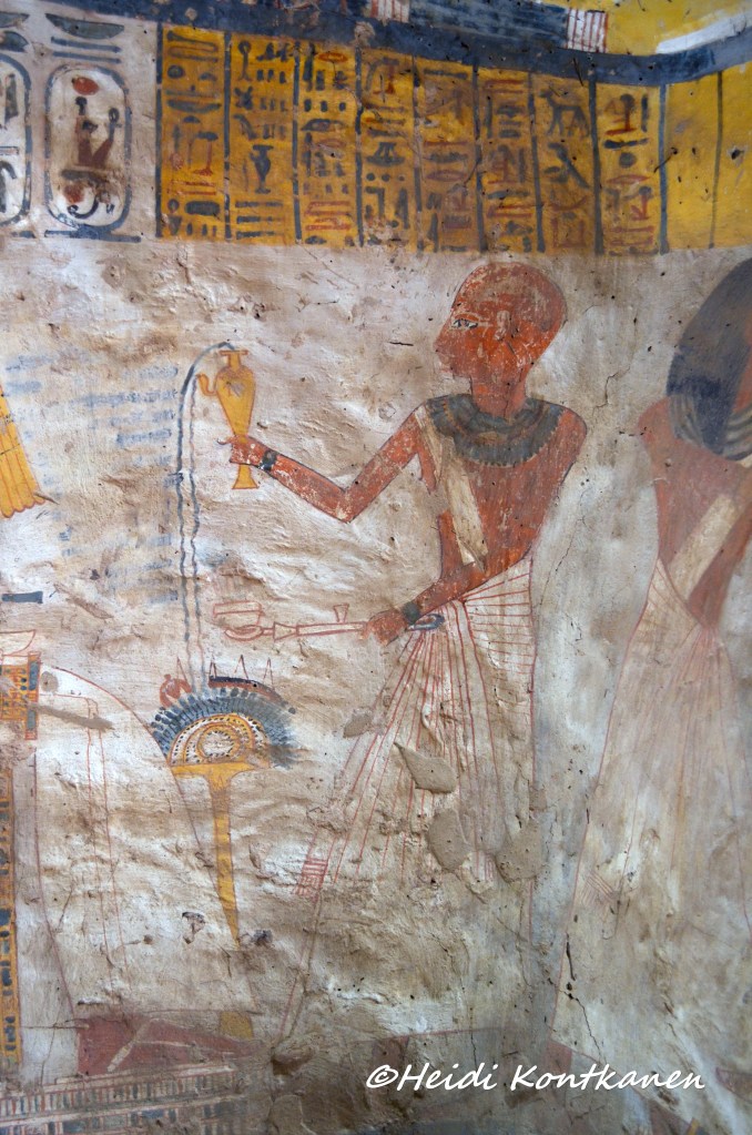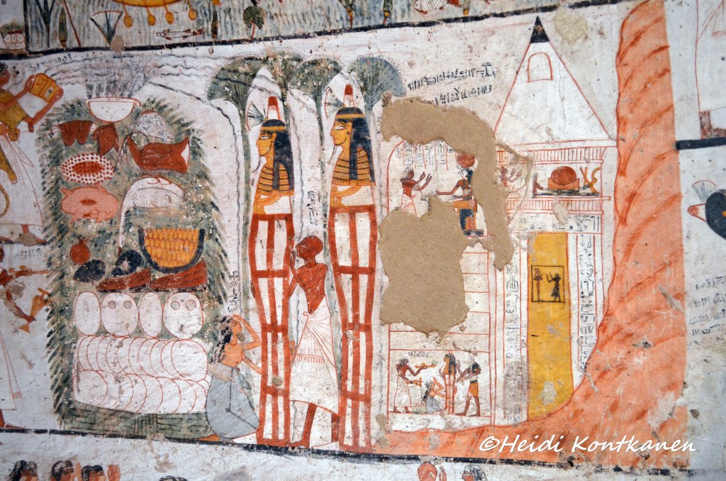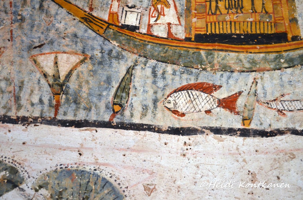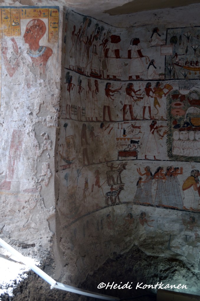 after the decorated entrance doorway, there is a small room with bright paintings, in which the illustrations seem to spring out from a bluish-white background. The texts are written in colourful hieroglyphs on a yellow background.