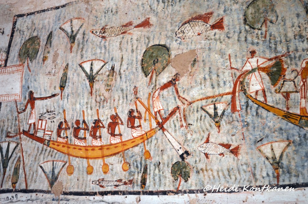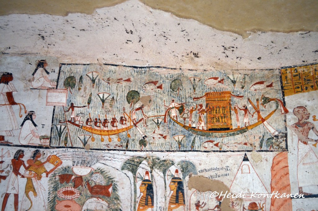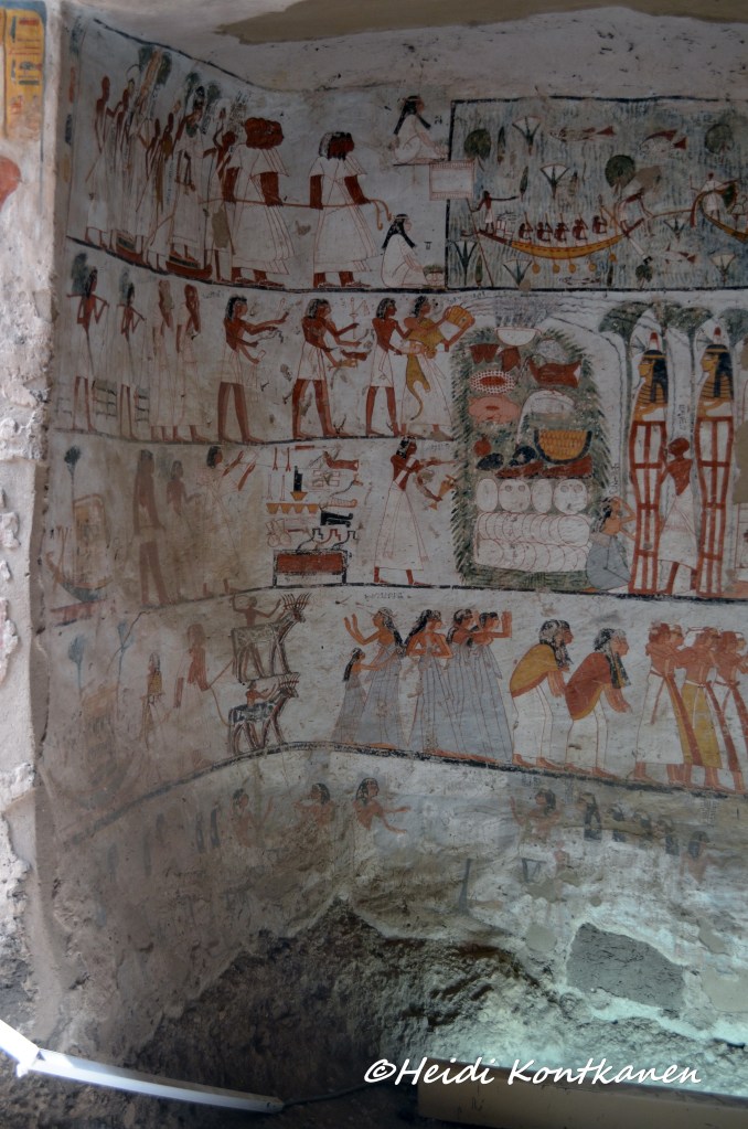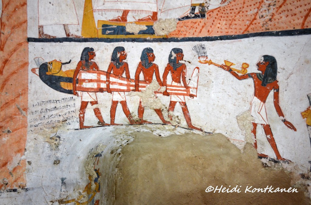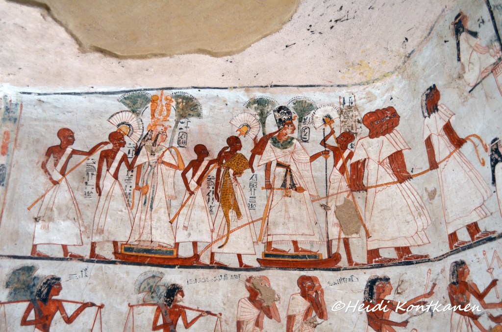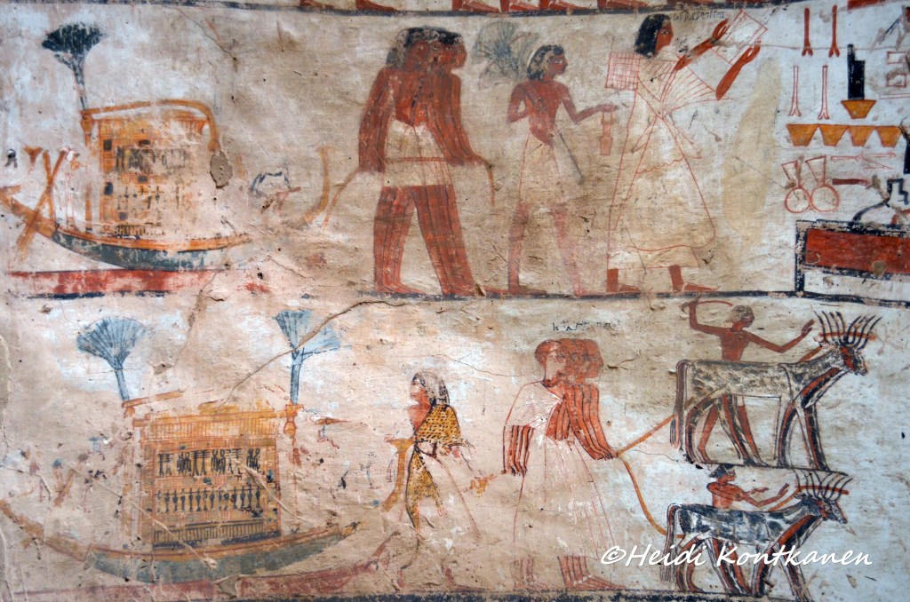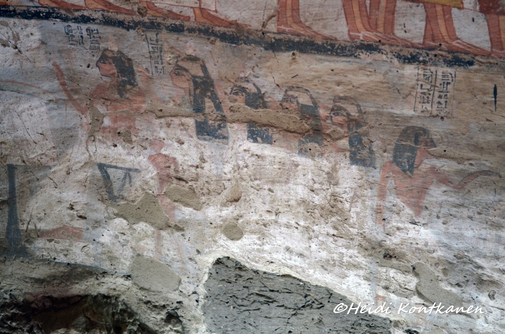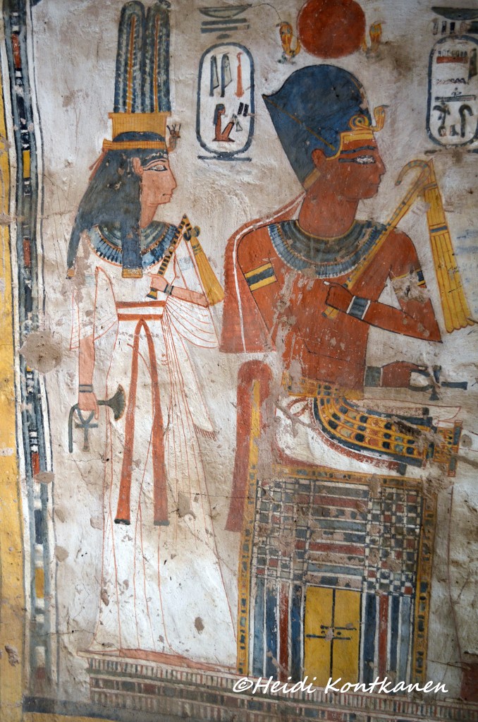 after the decorated entrance doorway, there is a small room with bright paintings, in which the illustrations seem to spring out from a bluish-white background. The texts are written in colourful hieroglyphs on a yellow background.
