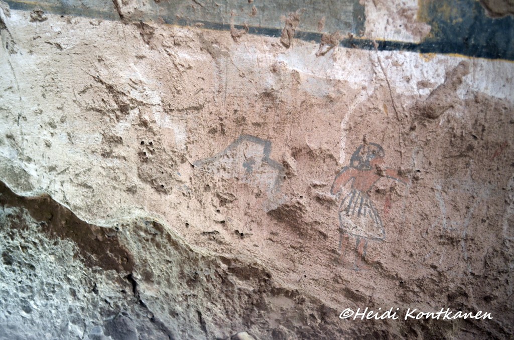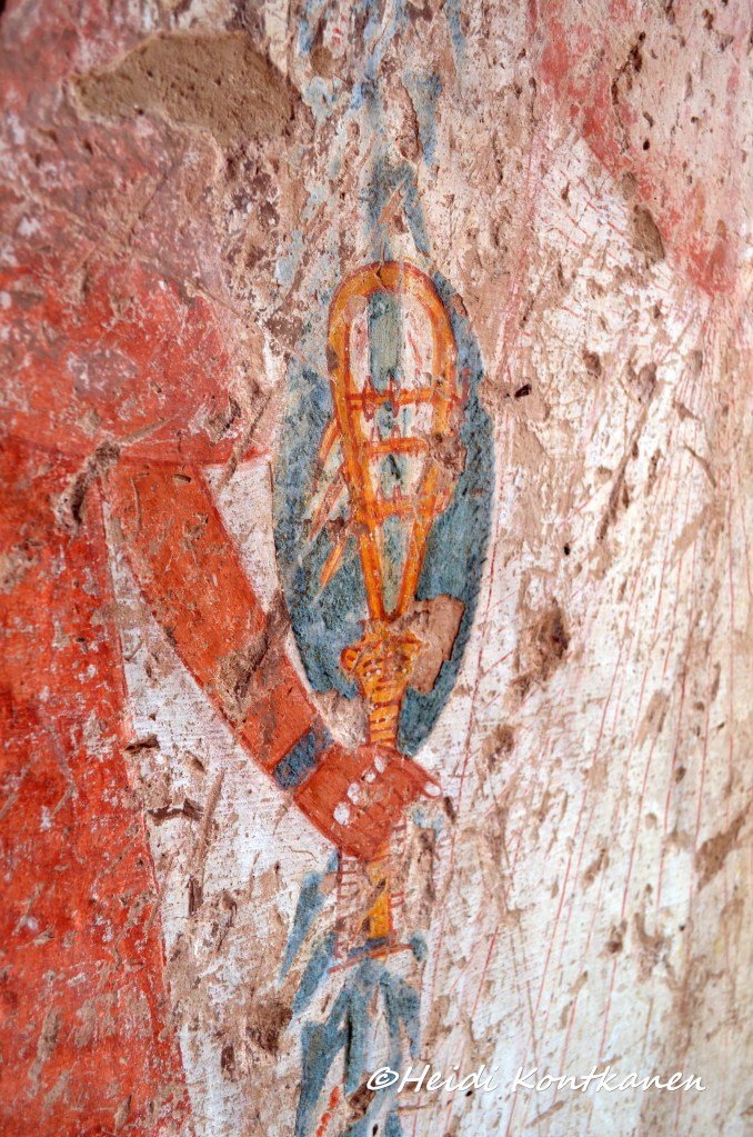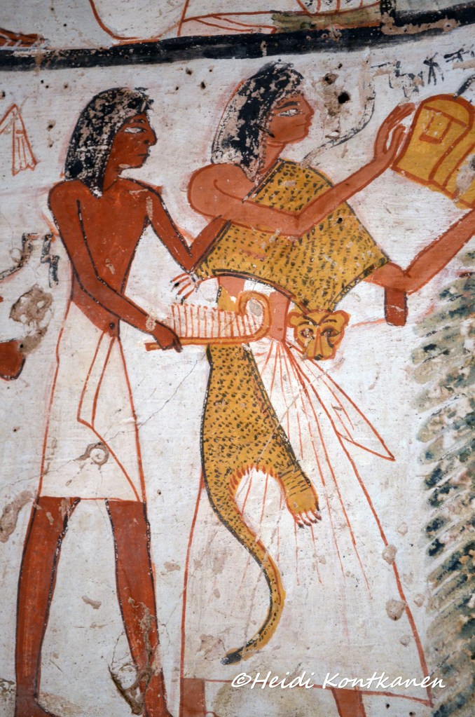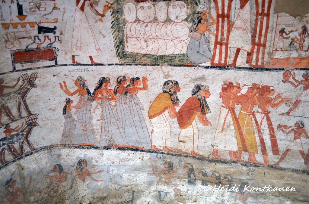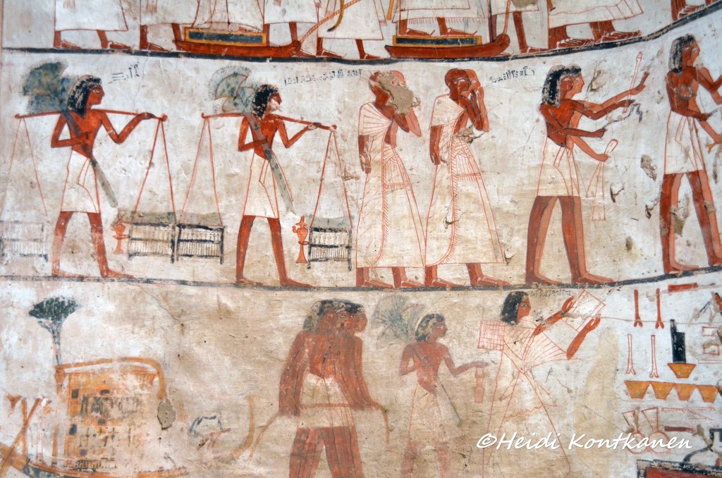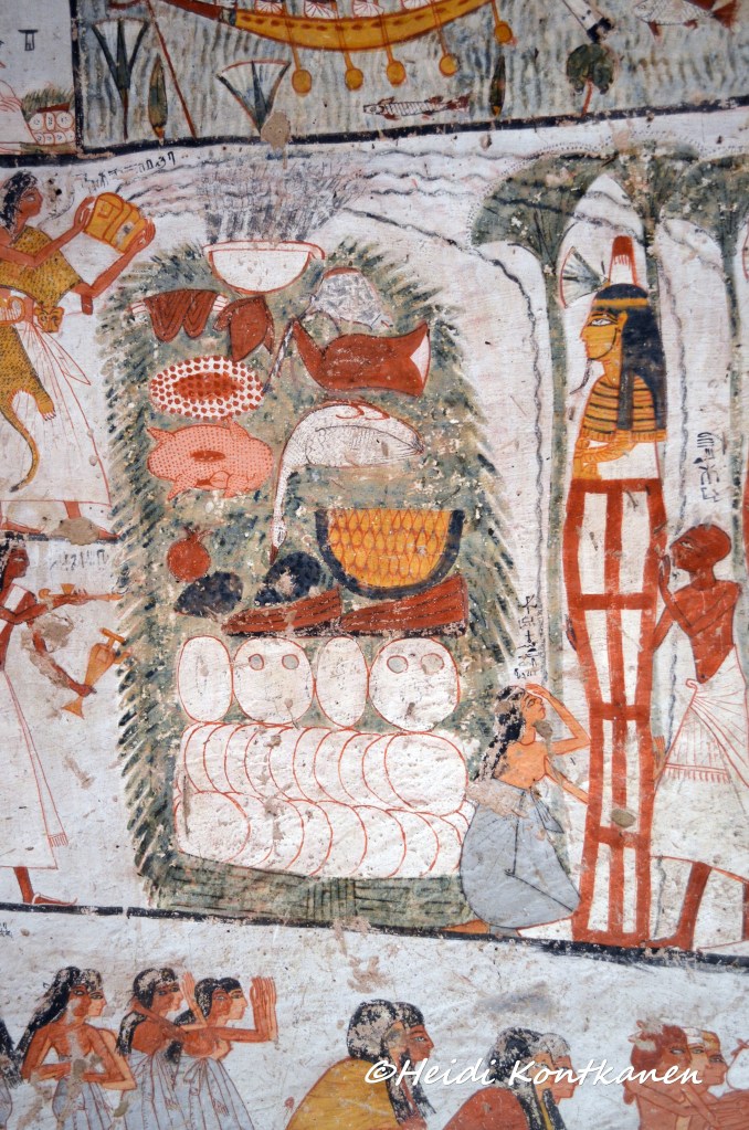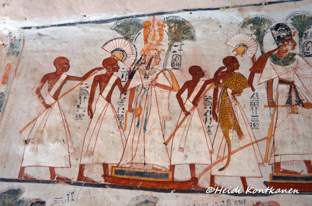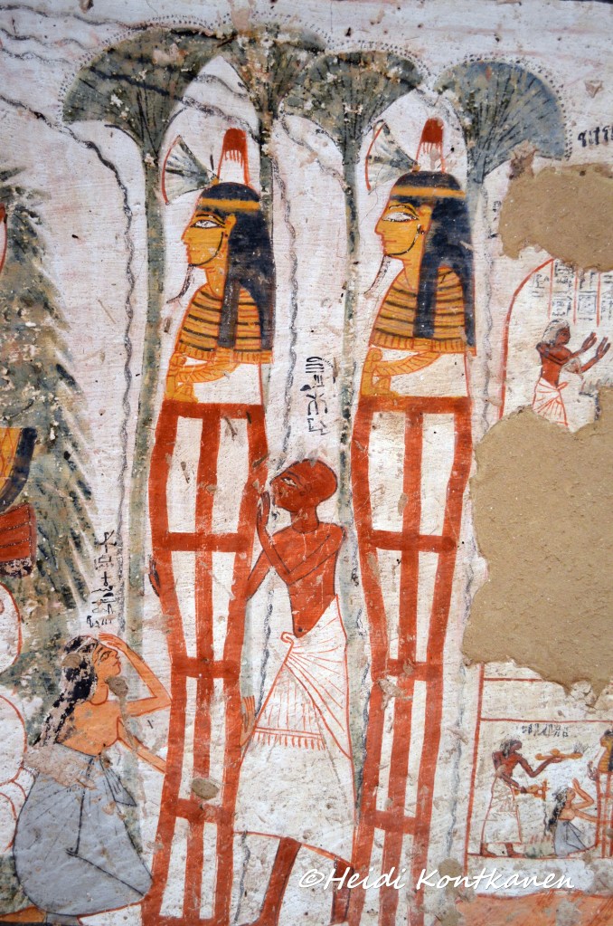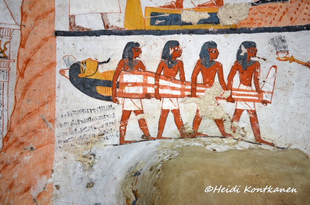 after the decorated entrance doorway, there is a small room with bright paintings, in which the illustrations seem to spring out from a bluish-white background. The texts are written in colourful hieroglyphs on a yellow background.