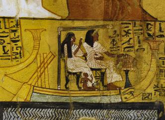 Pashedu and his wife sit before an offeringtable in a small boat of the Abydospilgrimage. One of their daughters sits atNedjem-Behdet’s feet. They both wearelegant pleated costumes made of fine linenand have long and elaborately coiffed hair.