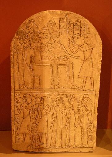 This round-topped stela is divided into 2 registers. In the top register, two deities seated on their thrones, are described This round-topped stela consists of 2 registers. In the top register, two deities seated on their thrones, are described in the hieroglyphic inscriptions together with their epithets. The first one is Amun-Re, lord of the Thrones of the Two Lands, residing in Waset, foremost of the Westerners, the great god. Behind Amun-Re sits his daughter Mut, lady of