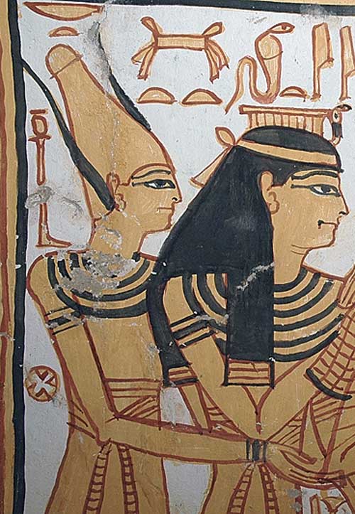 (See Wild, pl.4 and tb-1715.) Only part of the the image of the lady Iy, the wife of Nebnefer, remains and she is standing behind her husband who is actually portrayed on the south end of the west wall. “”His daughter, who makes his name live, Iy, ‘True of Voice’ by Osiris […]””. It is also on the west wall that the explanatory text, painted in beautiful coloured hieroglyphs, which ends in front of Iy, begins: “”To bring all good and pure things for your ka, the Osiris, master of the west, Un-nefer, master of the Sacred Land, the foreman of the team of the Place of Truth, Neferhotep. His son, who makes live his name, the foreman of the team of the Place of Truth, Nebnefer, ‘True of Voice’ by the great god. His sister, the chantress of Khnum, Satet and Anuket.”.”