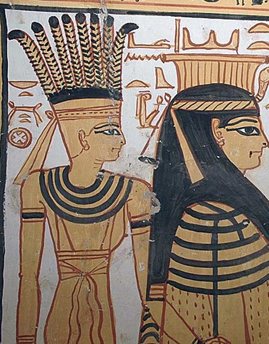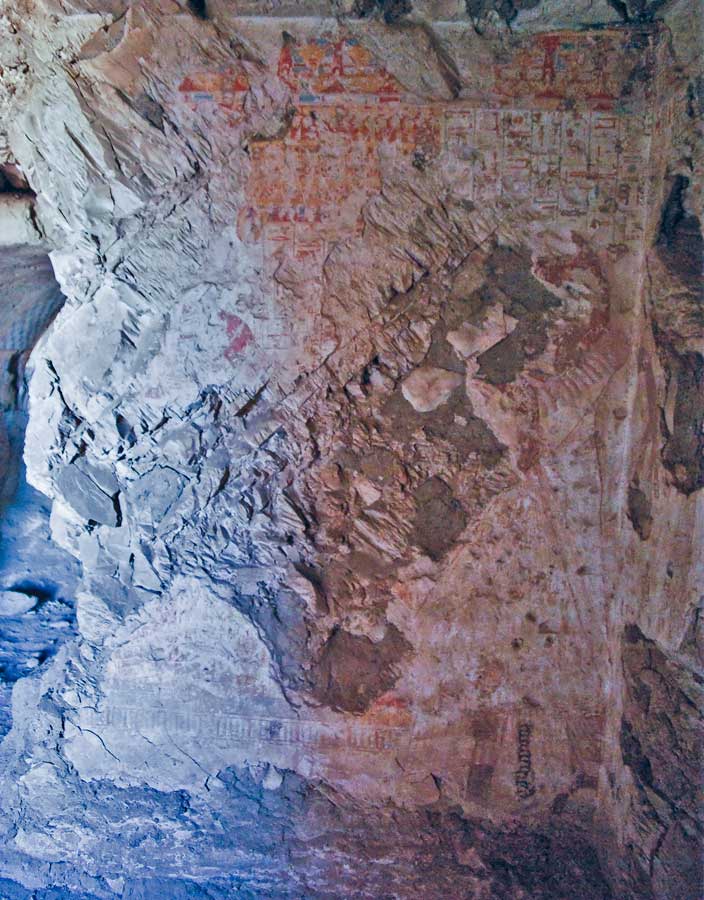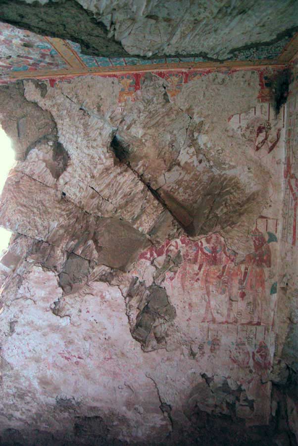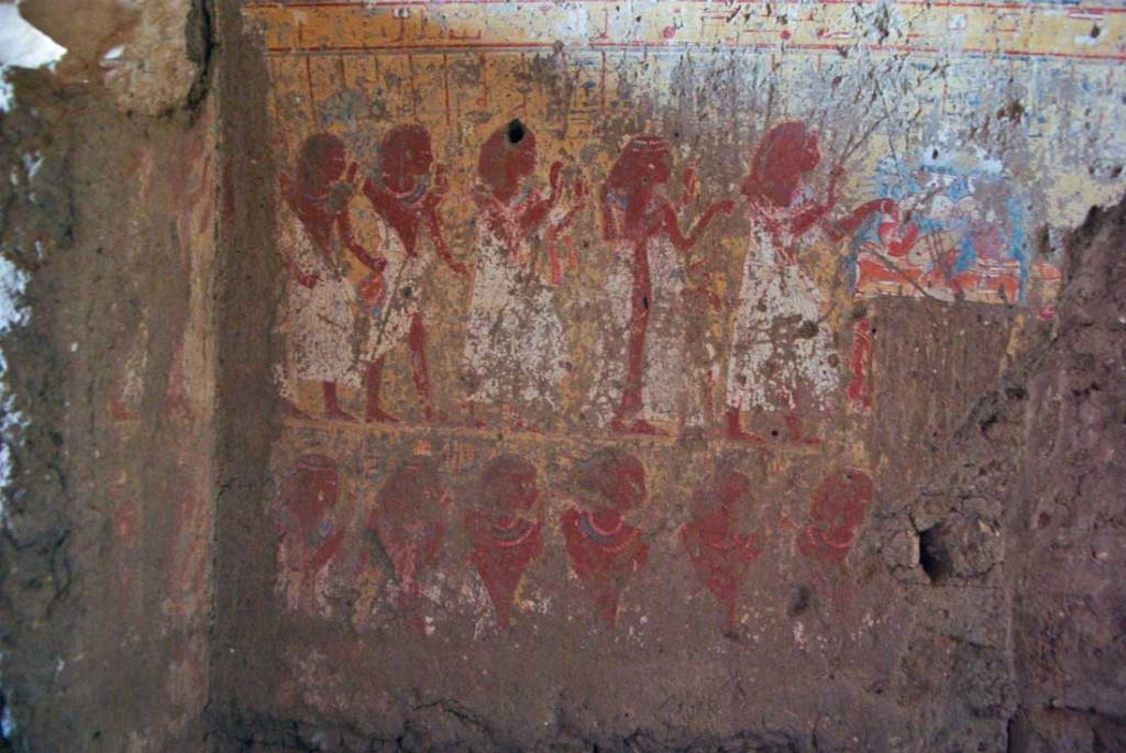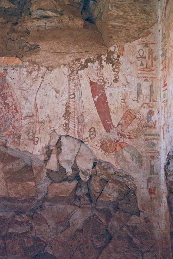 The walls were covered with a thick coating of mud which had been painted white. As is often the case in the Ramesside period, the same scene is no longer limited rigidly to a single wall, but may extend to the adjacent wall.