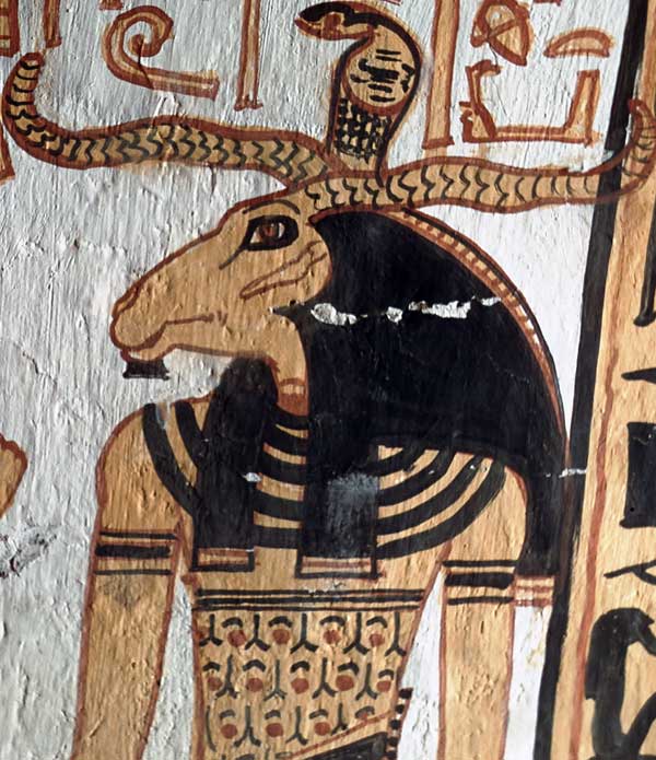 Khnum was one of the main ram gods of Egypt. Creator God, he shaped living things on his potter’s wheel. He was associated with the flood he held under his sandal and was considered as lord of the cataract, a mythical place where the flood was supposed to come from the caves of Hapi, the fertilising stream. Demiurge, lord of crocodiles, the ba of Ra when he appears as Khnum-Ra, the god is most often represented as a man with a ram’s head, wearing a short kilt and wearing a tripartite wig, sometimes topped with the Atef crown – which is readily associated with a pair of horizontal horns – or the white crown. Besides Elephantine, one of the important places of worship was Esna.