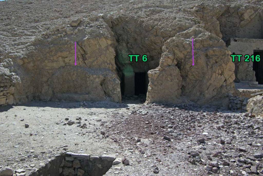 As seen in the image opposite, tomb TT6 is preceded by a terraced rectangular courtyard, adjoining the one of TT216, which is located to the right. Tomb TT216 belonged to Neferhotep (II), who was the grandson of Neferhotep (I) and son of Nebnefer.