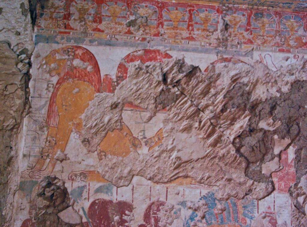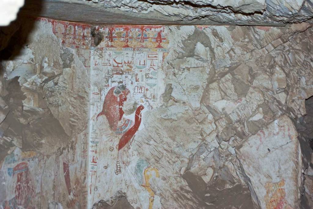 This is almost completely destroyed. Henry Wild recognised however, that immediately to the right of the opening leading towards the shrine (see tb-15) was the image of Re-Horakhty sitting under a kiosk, as Osiris does on the other side of the opening. The kiosk is surmounted with a complicated motif including, at the summit, a row of solar cobras (see tb-45). Toward him advances Nebnefer with a brazier in his hand, followed by his wife, Iy, who is actually on the north wall. In the text above him is mentioned Neferhotep (II), their son: “”making live his name”” (probably meant to be ‘their names’).
