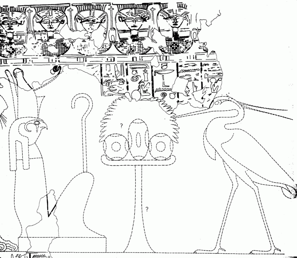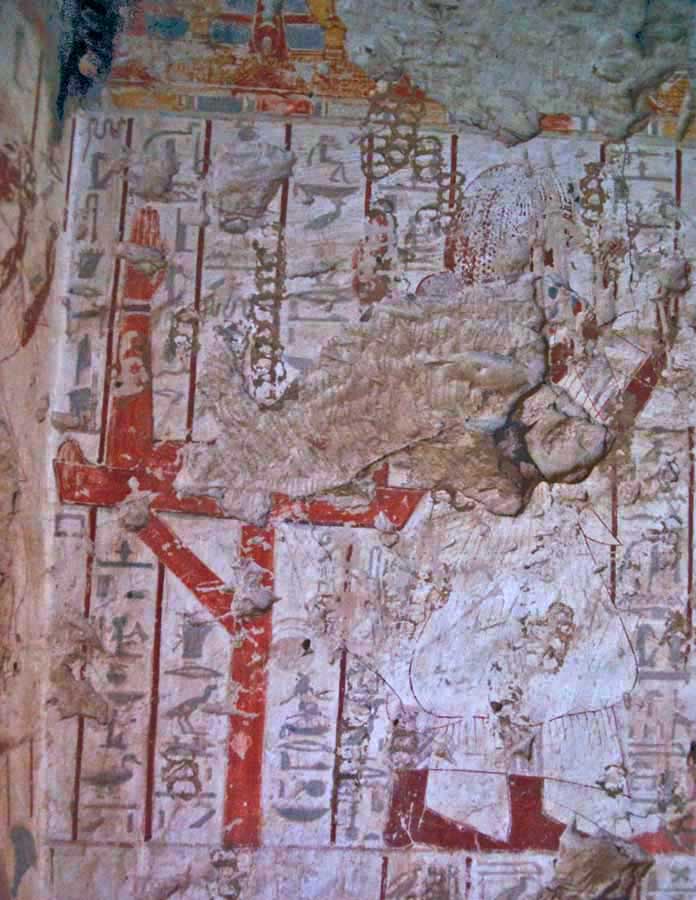 Further to the right, the wall is destroyed, but it is certain that it contained the image of a seated god of high authority, wearing the double crown (see tb-1739) and a wading bird, a grey heron, with a fragmentary text which refers to the transformation of the deceased benu bird (later the Phoenix of the Greeks) in Heliopolis. It is a theme which can be found in Chapter 83 and secondarily in Chapter 17 of the Book of the Dead, this transformation is one of those which the ba (soul) of the deceased hopes to accomplish. The deceased is often seen adoring the bird (as in the tomb of Inerkhau for example, tomb TT359), but not here.