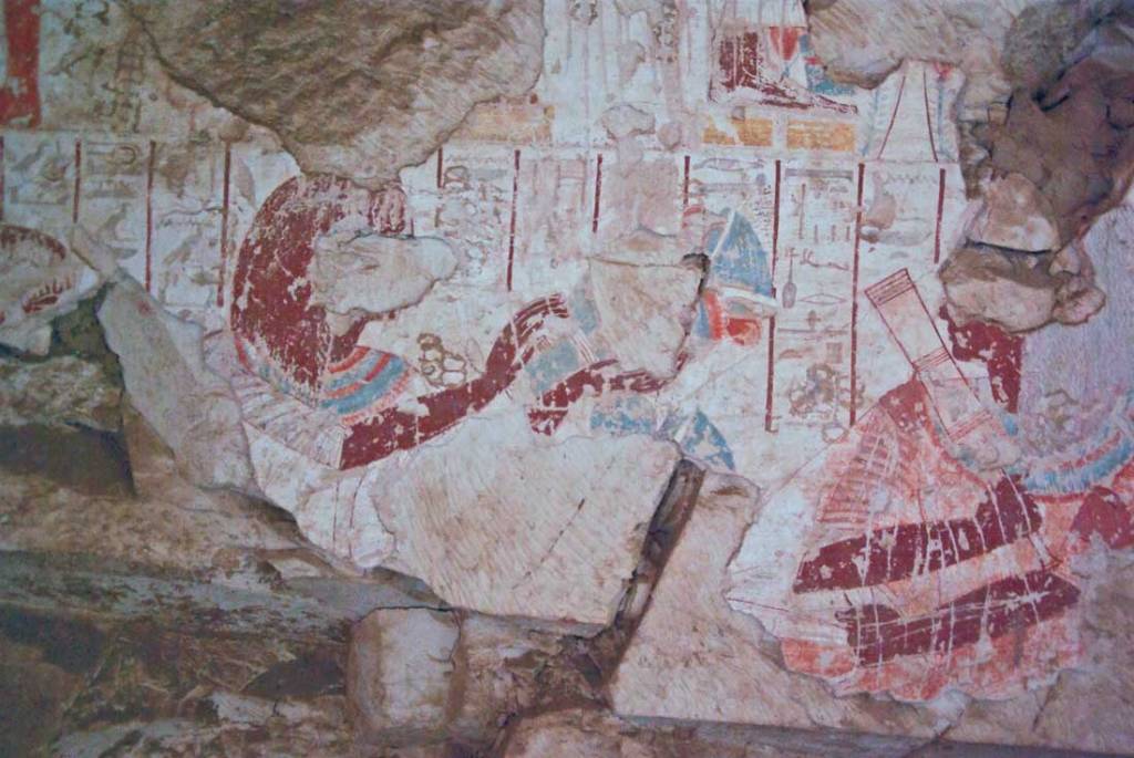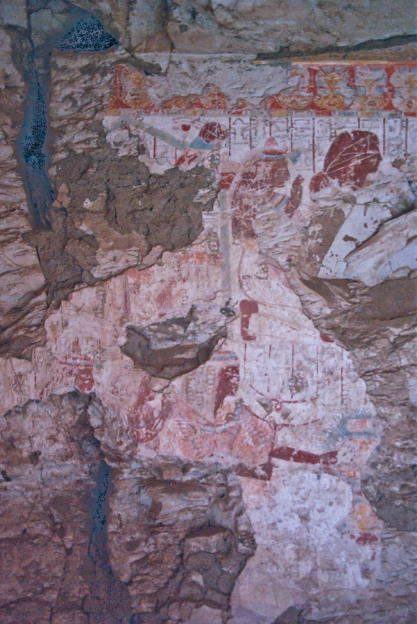 (See Wild, pl.5.) This is almost completely destroyed, see the left side of the image opposite. At the extreme right, a man is seen in adoration before the ka sign, which is actually located on the adjoining south wall.