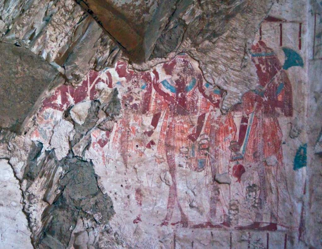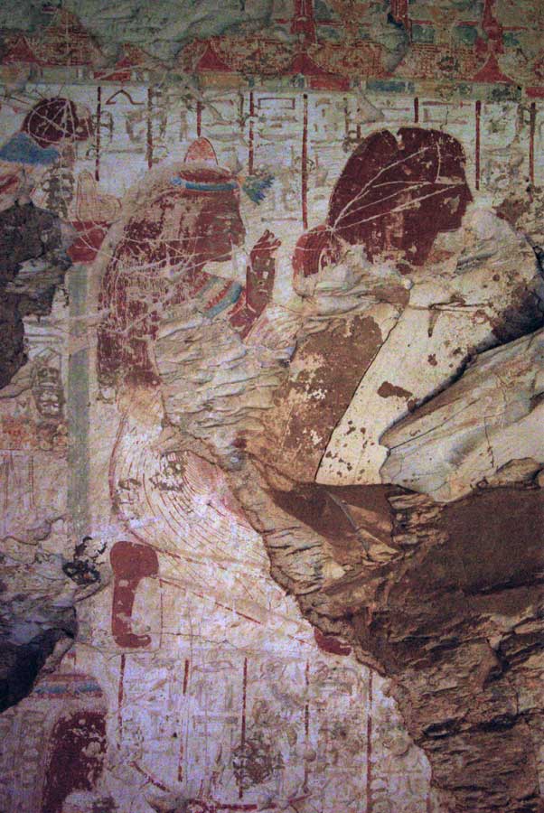 Turning to the left on entering the chamber, on the south part of the east wall and the south wall, the tomb owner and his wife pay homage to squatting gods.