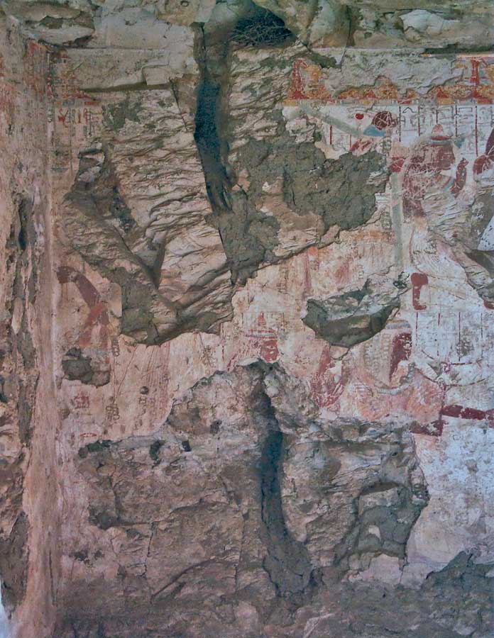 Today the tomb is entered by a collapsed corridor, of which only two small fragments still exist, one with a piece of the ceiling and some hieroglyphs forming the name Neferhotep (see tb-1708), the other with jars, amphorae and a shrine (see image to the right).