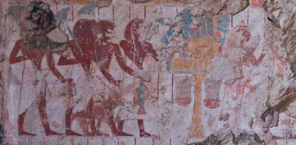 This is the extension of its counterpart on the north wall. Three couples, heading towards the left, are bringing offerings. Again, the columns to the text remained empty.