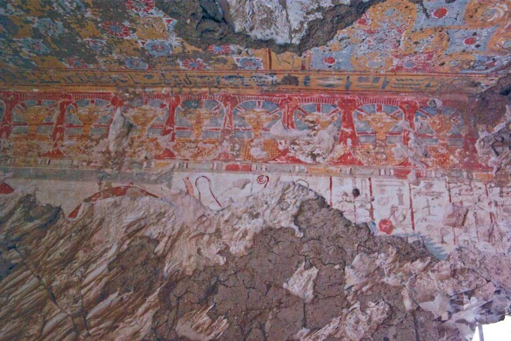 This has a vaulted surface, extending down to the two side walls to about a quarter of the full height of the chamber. Even the upper surface of the side walls are slightly curved at the top (see the image to the right). The ceiling is centred, from the entry to the rear wall, by two side-by-side text columns of hieroglyphic text on a yellow background; each column being edged with a red line and a blue one. At each side of the two texts is a motif formed of zigzag lines of different colours (see tb-1746 and tb-1747). On either side, north and south, are four rectangular areas. The two outer rectangles are decorated with geometric patterns.The middle two, although difficult to examine, actually contain scenes. All the four sections are edged with a column of text on a yellow background. At the junction of the ceiling and the side walls there is another row of coloured text, again on the usual yellow background (see the bottom of tb-1747).