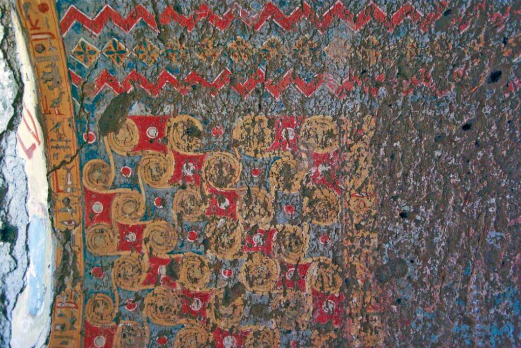 The ceiling is divided into rectangular areas by yellow bands edged with one or two red lines and having blue hieroglyphs. The patterns of the enclosed areas are varied, containing circles, rosettes, leaves, etc. (see tb-1728, tb-1727 and tb-1726).