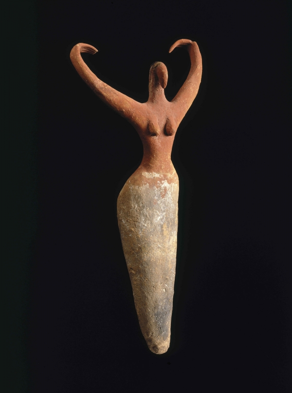 Based on images painted on jars of the same date, the female figure with upraised arms appears to be celebrating a ritual. The bird-like face probably represents her nose, the source of the breath of life. The dark patch on her head represents hair, also a human trait. Her white skirt indicates a high-status individual.
