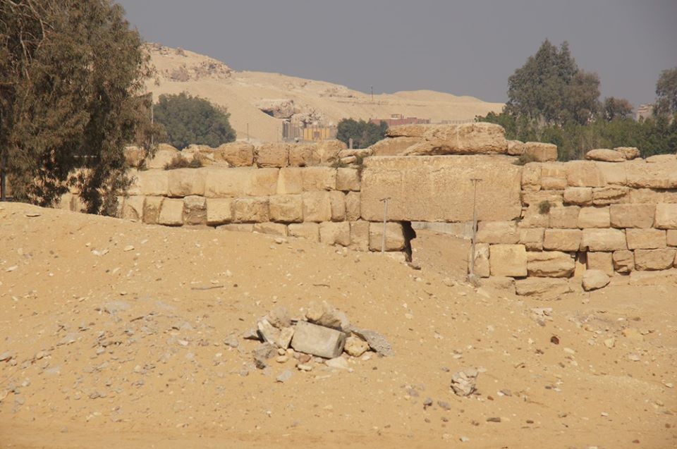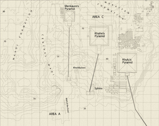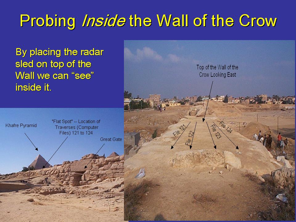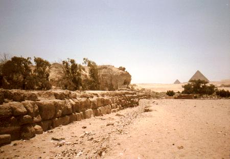 EThere is a massive, ancient stone wall that stands a few hundreds yards south of the Sphinx. But because it lay partially buried and overshadowed by the larger, more famous Great Pyramid, Sphinx, and other pyramids, tourists have hardly noticed it.Known locally as the Wall of the Crow (Heit el-Ghurab) it is 200 meters (656 feet) longten meters (32.8 feet) high and ten meters thick at the base. The Wall is the northwest border of a tract of low desert that we designated Area A