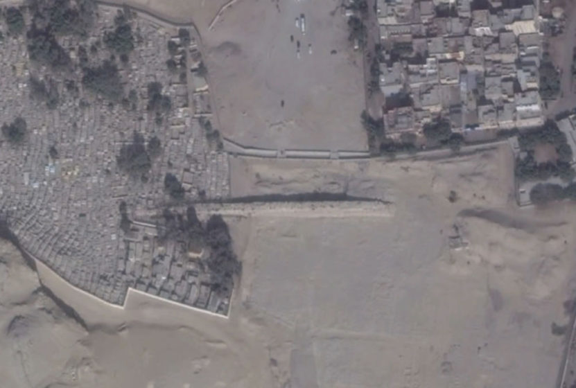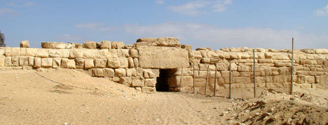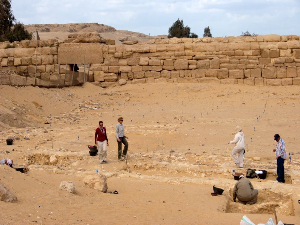 The Wall of the Crow stands just to the south of the stream bed and could have served to deflect the floodwaters.Wall of the Crow near the Great PyramidIf the inhabitants built the massive stone wall for protection against desert flooding, why not extend it across the northern end of the whole Gallery Complex? Perhaps they thought that the thick, mud brick northern wall of Gallery Set I could withstand the wadi floods. The Wall of the Crow might then have been meant to protect the western flank of the Gallery Complex.In fact, an earlier settlement here might actually have succumbed to flash floods. In the lowest layers, those predating the Gallery Complex, we found settlement debris—mud bricks, pottery fragments, and limestone rocks—mixed with mud and pebbles washed down from the natural gravel in the high desert.We continue to look for evidence to support a hypothesis that the Wall may have served as flood-control to protect the workers settlement.Sacred structureLate Period burials sprawl in a large cemetery across the northwestern portion of our site, with grave upon grave cut into the Old Kingdom deposits. Toward the eastern end of the Wall of the Crow, the graves increase in density like the epicenter of a galaxy.Late Period burial near the Great PyramidThe Late Period (747-525 BC) residents of nearby towns must have considered the area around the Wall of the Crow as sacred ground. The burials extend right up to the east end of the Wall, with some of the dead interred in the sand above rocks that tumbled from the Wall. These burials post-date the collapse of the eastern end of the Wall.Caches of animal bone that we encountered in the same sand layer as some of the nearby Late Period burials are another sign of the Wall’s sanctity.One cache included two skulls—from a bovine and a smaller animal, possibly a goat. Another cache contained two cattle skulls. In the spring of 2000, when we began clearing the southern side of the Wall of the Crow near the east end, we encountered a third cache—a bovine skull and a Late Period amphora tucked into a niche between the blocks of the Wall.Next to the eastern end, the percentage of child burials is higher than in other areas: 60% compared with, for example, 27% in a nearby square.Many of these children were adorned with jewelry and amulets, while adult burials contained no grave accoutrements. We do not yet understand the significance of these special child burials.The Wall of the Crow todayThe area around the Wall of the Crow is still a burial ground. An Islamic cemetery engulfs the west end of the Wall and a Coptic Christian cemetery lies just south of it. During funerals, the deceased is carried in a procession through the great gate in the Wall.It is possible that this part of our site was a burial ground from late Roman to early Christian times. The first Muslim graves, the tombs of sheikhs (learned Muslim men) were built north of the west end of the wall.Both cemeteries—Coptic and Muslim—have wells; water sources are often associated with sacred traditions.The Wall of the Crow is also associated with fertility even today. Until recent years, women hoping for children would squat near a nail (a bronze survey peg pounded into the Wall by a surveyor many years ago), and then walk around the raised limestone blocks seven times.Through the millennia that the Wall of the Crow has laid half-buried, it has maintained its sacred aura and perhaps become even more mystical. We certainly look in awe upon this massive structure poised between the worlds of the living and dead, both ancient and modern.