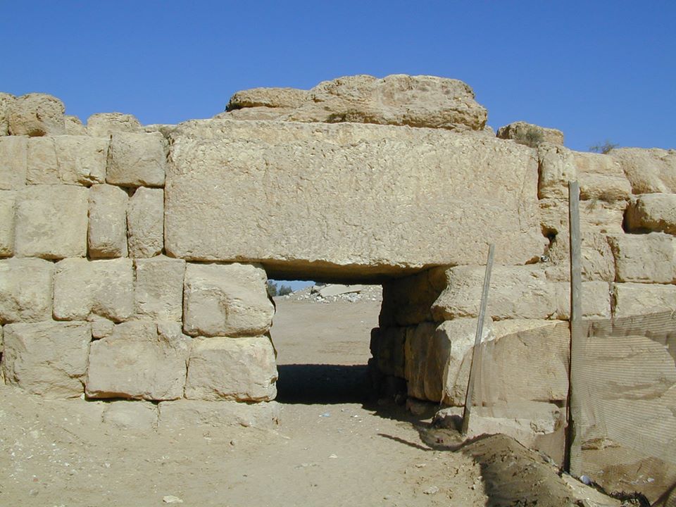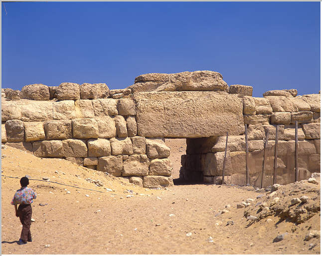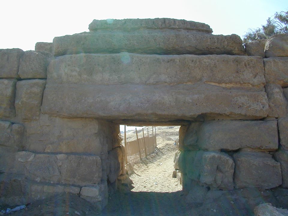 We suspected that the Wall of the Crow dated to the Old Kingdom 4th Dynasty (2575-2465 BC) like the Giza Pyramids and the Sphinx but we do not know why the Egyptians built it. Evidence suggests that they never completed the mammoth undertaking. They never dressed the masonry to produce a finished face to the structure, as was their standard practice with pyramids, tombs, and temple walls.We can now say for certain that the Wall of the Crow was built as part of our 4th Dynasty (2551-2472 BC) complexand the archaeology has led us to form some ideas as to its function.Gateway to the sacred?The great gateway in the Wall of the Crow may be one of the largest gateways from the ancient world. It has been visible for the last 4,500 years and yet very little has been written about it.Once we cleared away a thick, sandy overburden, we discovered what an impressive structure the gate is—2.5 to 2.6 meters wide (about 8.5 feet or five ancient Egyptian cubits) and about 7 meters (23 feet) highBecause the base of the Wall is more than 10 meters thickthe gate is actually a short tunnel.The ancient roadway going through the gate was paved with worn or abraded ceramic fragments and laid out with a subtle camber —