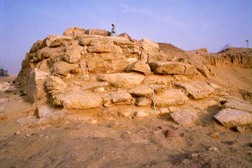 The Wall may have separated the sacred precincts of the pyramid plateau from the precincts in which the workers lived. The Enclosure Wall that bounds the Gallery Complex on the west nearly abuts the Wall of the Crow, and the regulated passageways out of the settlement—especially Main Street, the principle axis—led right to the massive gateway in the Wall of the Crow.Gallery set at the east end of the Wall of the Crow.In 2002 we found clear evidence that the Gallery Complex (at least Gallery Set I) predated the Wall of the Crow. Until then we were not certain where the Wall ended on the east. The eastern end of the Wall slumped in two layers of large stones, the result of collapse and robbing in late antiquity (we found Late Period burials under the lowest layer of toppled stones).The remains of the gallery walls were about waist to chest-high at the eastern end of the Wall, but about three meters to the east (10 feet), the gallery ruins were cut down to ankle level in a great depression.A massive deposit of granite dust and chips filled this big depression. The granite was from large-scale work nearby, possibly cuttings from the granite casing on the Menkaure Pyramid.But what force cut this depression through the mud brick gallery walls well before the end of the 4th dynasty occupation on our site? Perhaps a flash flood.Flood control?Geoarchaeologist Karl Butzer, who studied the environmental history of our site, believes that the 4th Dynasty Egyptians built their settlement on the outwash of a wadi, a stream bed that occasionally carried heavy floods running off the high desert.