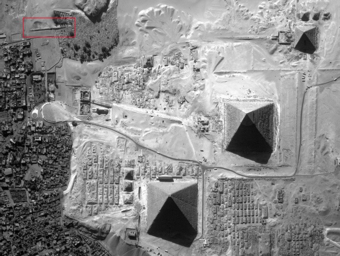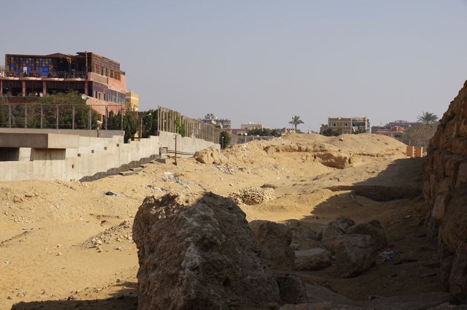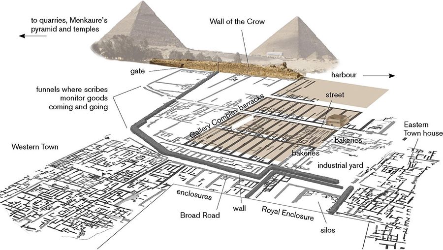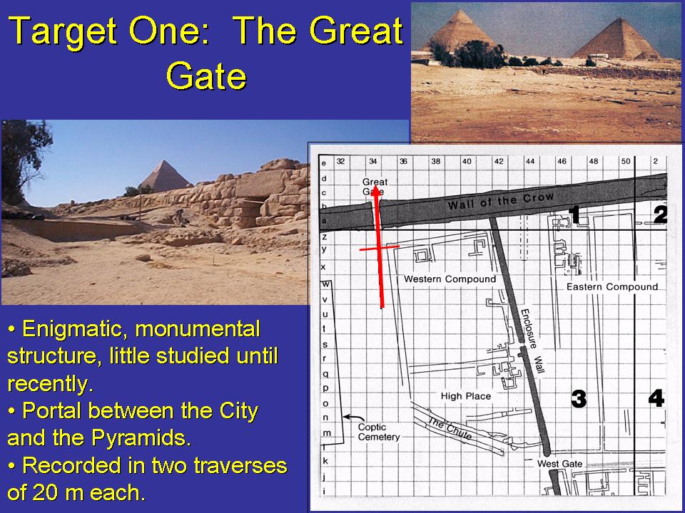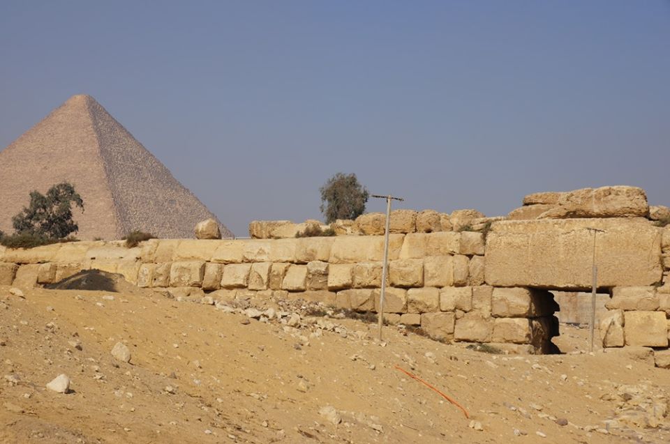 After placing the stones, the builders left the debris immediately in front of and inside the gate. Upon this debris, traffic formed a path that slopes down 2 to 3 meters (6.56 to 9.84 feet) from north to south. The path passes through the gate to a broad terrace formed of compact sandy masons’ debris that extends at least 30 meters north of the gate.FunctionWall of the Crow in relation to Great Pyramid & other pyramidsWhy did the builders put so much effort into an immense stone structure that was not part of a pyramid complex nor connected to other structures at Giza?