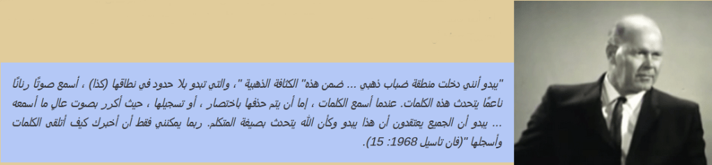 “يبدو أنني دخلت منطقة ضباب ذهبي … ضمن هذه” الكثافة الذهبية “، والتي تبدو بلا حدود في نطاقها (كذا) ، أسمع صوتًا رنانًا ناعمًا يتحدث هذه الكلمات. عندما أسمع الكلمات ، إما أن يتم حذفها باختصار ، أو تسجيلها ، حيث أكرر بصوت عالٍ ما أسمعه … يبدو أن الجميع يعتقدون أن هذا يبدو وكأن الله يتحدث بصيغة المتكلم. ربما يمكنني فقط أن أخبرك كيف أتلقىالكلمات وأسجلها “(فان تاسيل 1968: 15