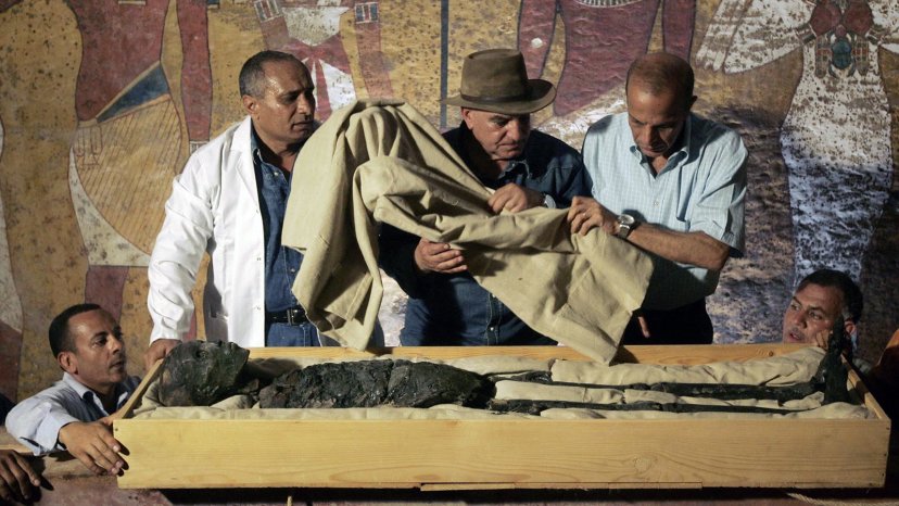 Egypt’s antiquities chief Zahi Hawass (center) supervises the removal of the linen-wrapped mummy of King Tut from his stone sarcophagus in his underground tomb in the Valley of the Kings in November 2007.
