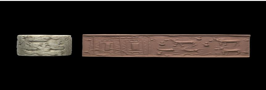The seal is typical of a style using filed lines and drill-holes, found in the Diyala, north-east of Baghdad, but also in Syria. Seals like this are evidence of a trade network between the two regions.