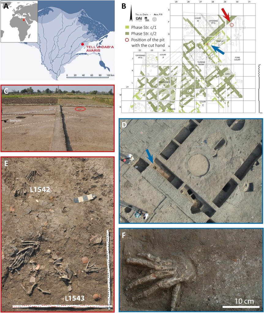 أدلة أثرية على قطع الأيدي في فترة الهكسوس تل الضبعة ، شمال مصر (صور ÖAI، M. Bietak): (أ) دلتا النيل ، شمال مصر (خرائط أبل) وموقع موقع تل الضبعة / أفاريس في دلتا النيل. تم تعديل هذه الخريطة من الشكل 1 (رسمها Nicola Math ، وتم تعديله بواسطة Dominik Fill ، الأكاديمية النمساوية للعلوم) في: Manfred Bietak ، “Hyksos” في “Hyksos ،” R. Bagnell ، وآخرون. (محرران) ، موسوعة التاريخ القديم ، المجلد. 6، 1st edition، Malden، MA- Oxford 2013: Wiley-Blackwell، 3356–3362. يسمح مالك حقوق النشر Manfred Bietak بنشر الخريطة بموجب ترخيص الوصول المفتوح CC BY. (ب) الجزء الشمالي من قصر الهكسوس في تل الضبعة ، المرحلة E1-D3 (بعد بيتك وآخرون .2012 / 2013). السهم الأحمر يشير إلى Pit L1542 و 1543 ، والسهم الأزرق يشير إلى Pit L1777. (ج) لمحة عامة عن مساحة الحفرة L1542 و 1543 (الدائرة الحمراء) ، طبقة الحفريات القريبة من السطح الحديث في المنطقة الزراعية. (د) الجدار الجنوبي لمبنى واسع الغرفة تم إضافته فيما بعد تم بناؤه مقابل جدار السياج الغربي للساحة الأمامية للقصر. حفرة L 1777 أمام حجرة العرش (المشار إليها بالسهم). (هـ) نظرة عامة على الأيدي اليمنى الإحدى عشرة الموجودة في الحفر L1542 و L1543. (F) يد يمنى واحدة على سطحها الراحي بأصابع مفلطحة. من سيناريو متعدد التخصصات أوسع ، تتناول النتائج المعروضة في هذه المقالة أسئلة حول تجسيد العنف في سياق الحرب ، وعلى وجه التحديد ، أخذ الكأس كلغة منظمة للهيمنة.