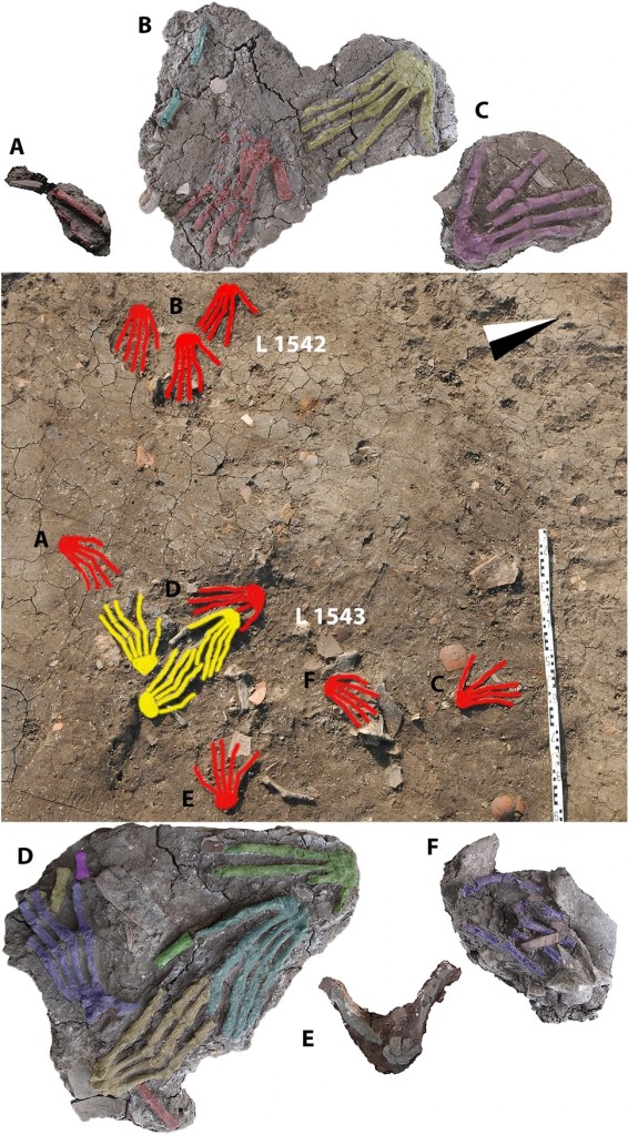 إعادة البناء الأنثروبولوجي لاكتشاف وتفاصيل اليد اليمنى لـ Pits L1542 و L1543 (إعادة البناء وصور الأيدي الفردية ، J. Gresky): إعادة بناء الأيدي الكاملة في Pits L1542 (الزاوية العلوية اليسرى) و L1543 (النصف السفلي من صورة). توضع الأيدي الصفراء على السطح الظهري بينما توضع الأيدي الحمراء على الراحتين. يتم إعادة بناء العناصر المفقودة. (A، C-F) ثمانية أيدي يمنى من Pit L1543 ، جنبًا إلى جنب مع الكتائب الفردية التي يمكن أن تمثل أيديًا إضافية أو قد تنتمي إلى اليدين الحالية. العظام المحفوظة ملونة. (ب) ثلاث أيادي يمنى على سطح الراحية في الحفرة L1542. العظام المحفوظة ملونة.