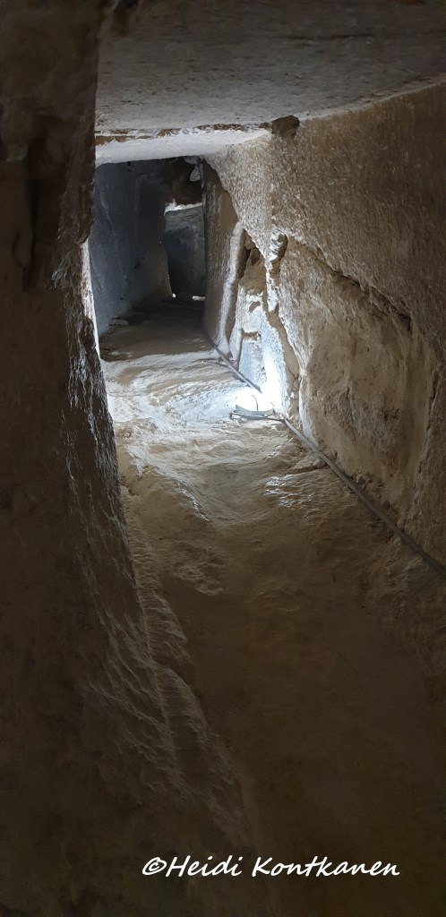From the north side a long, sloping passage leads to a narrow antechamber with an impressive corbelled roof.